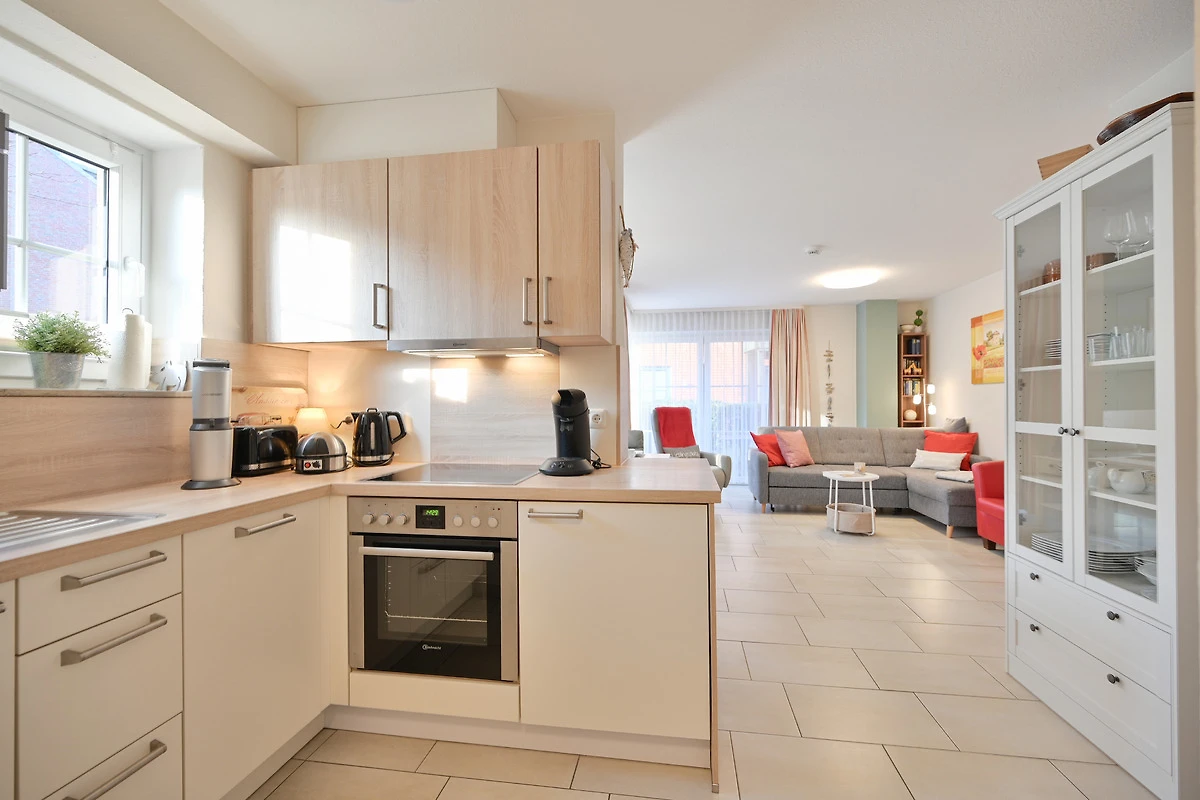 Die neuwertige zum Wohnraum hin geöffnete Küche, ist mit einer Spülmaschine, Ceranfeld, Backofen, Mikrowelle und Kühlschrank mit Gefrierfach ausgestattet.