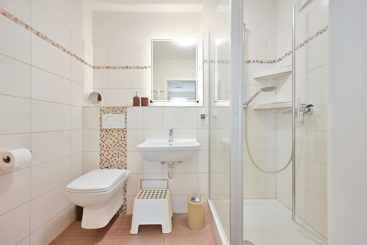 Das modernisierte Badezimmer ist mit einer Dusche (niedriger Einstieg), einem Fön und Kosmetikspiegel ausgestattet.