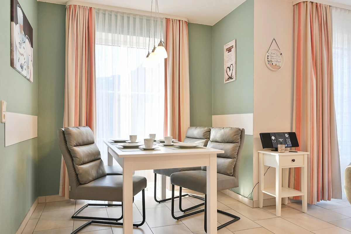 An dem gemütlichen Essplatz mit einem Tisch und 4 bequemen Essstühlen kann man den Tag mit einem leckeren Frühstück beginnen.