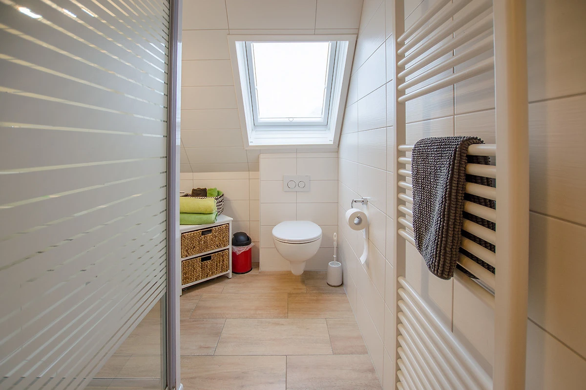 Das Badzimmer ist mit grosser Dusche, WC ausgestattet und hat ein Aussenfenster.