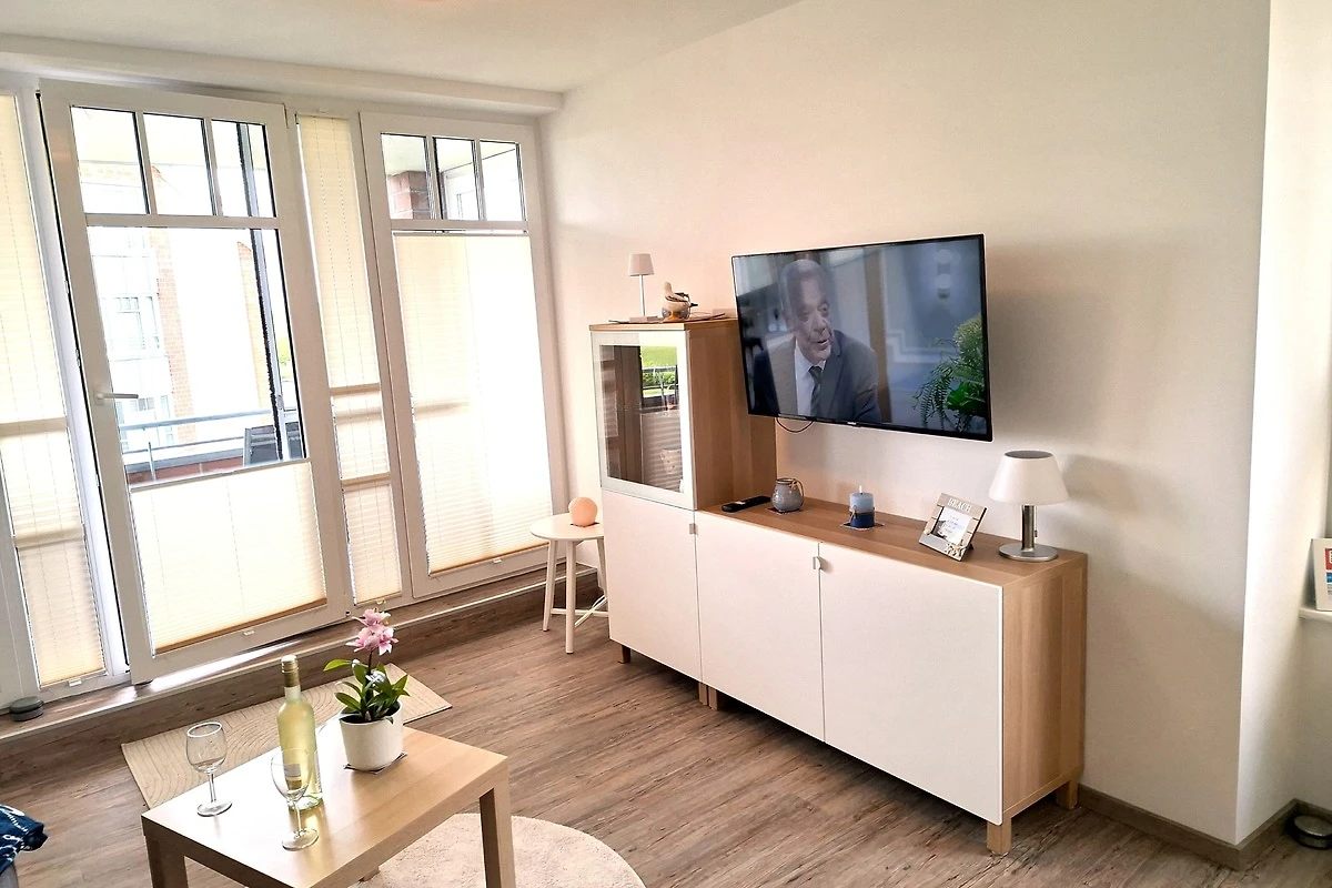 Es ist eine Eckwohnung, die lichtdurchflutet ist. Flachbildfernseher