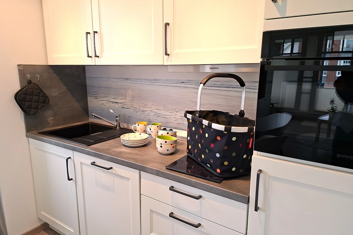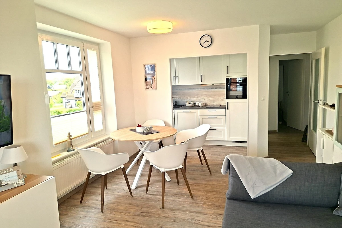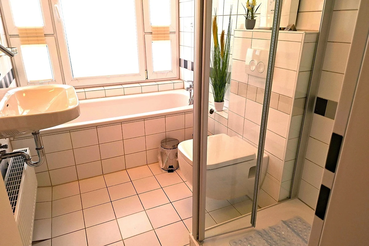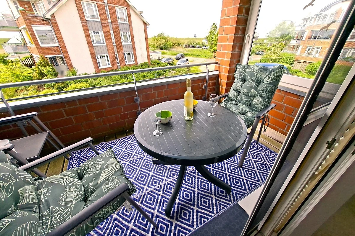 Vom Balkon aus (Balkonbestuhlung vorhanden )blicken Sie auf den Nordseedeich und die Nordseemarsch. Der Balkon ist eingezogen, ein Nachbar hat keinen Einblick. Das Badezimmer ist modern eingerichtet.