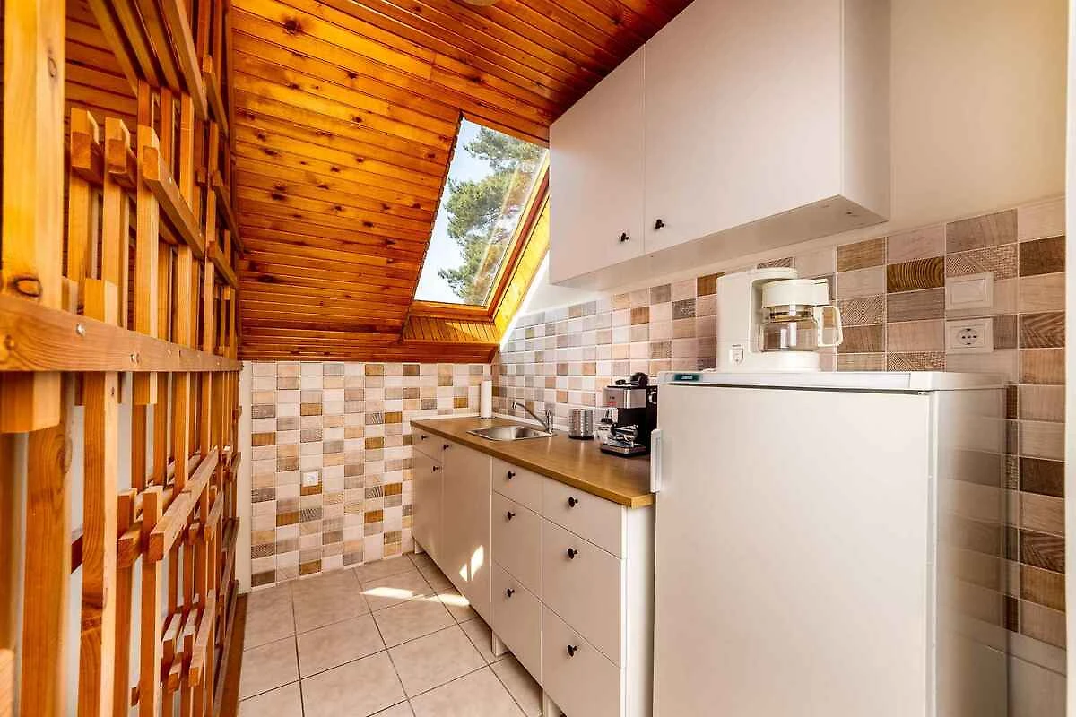 1. Etage: Schlafzimmer mit 1 Gitterbett. 2 Schlafzimmer jeweils mit 1 Doppelbett und Zugang zum Balkon. Galerie mit Küchenzeile mit Essecke, Kühlschrank, Kaffeemaschine. Bad mit Badewanne mit Duscheinrichtung und 1 Waschbecken. Separates WC mit WC.