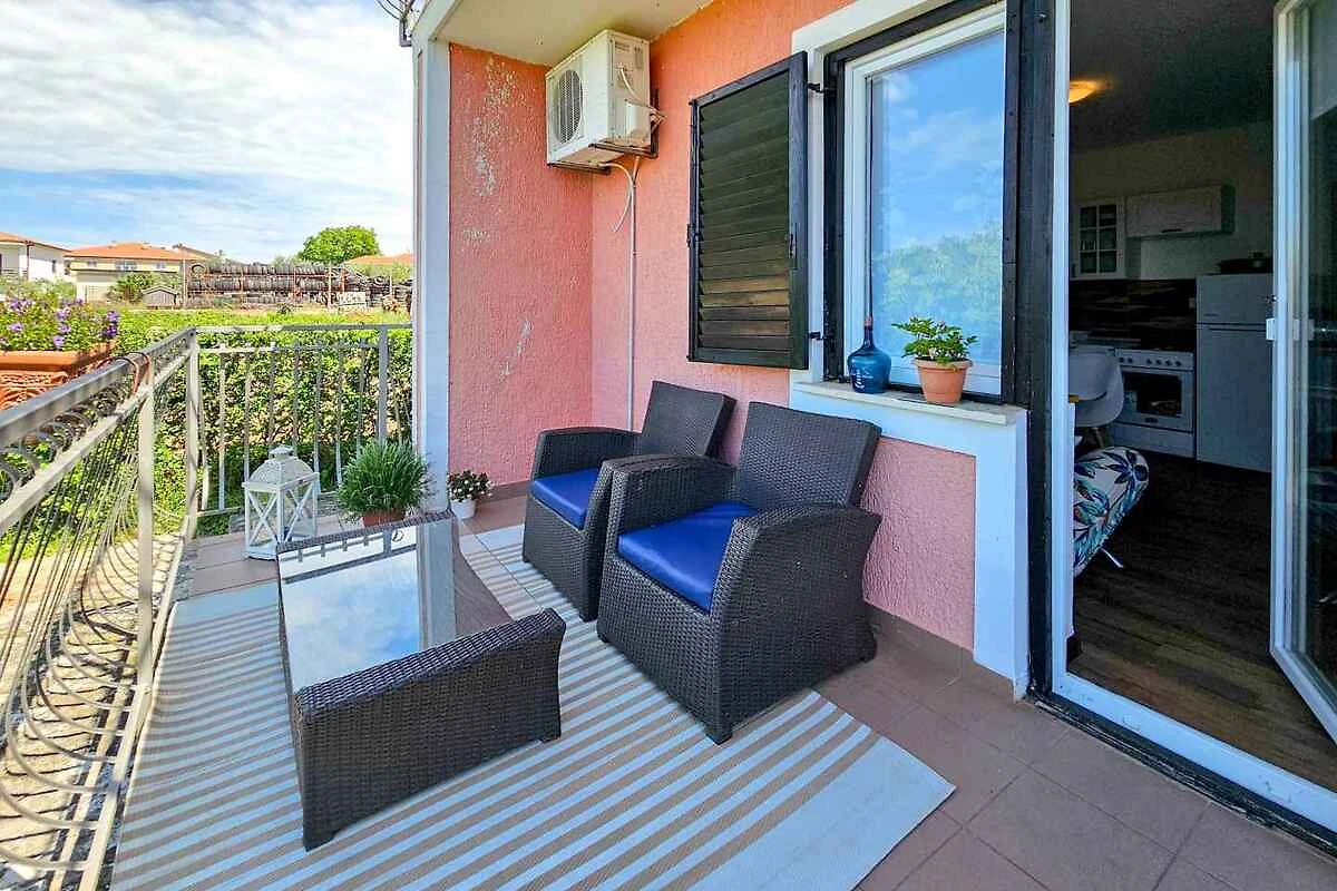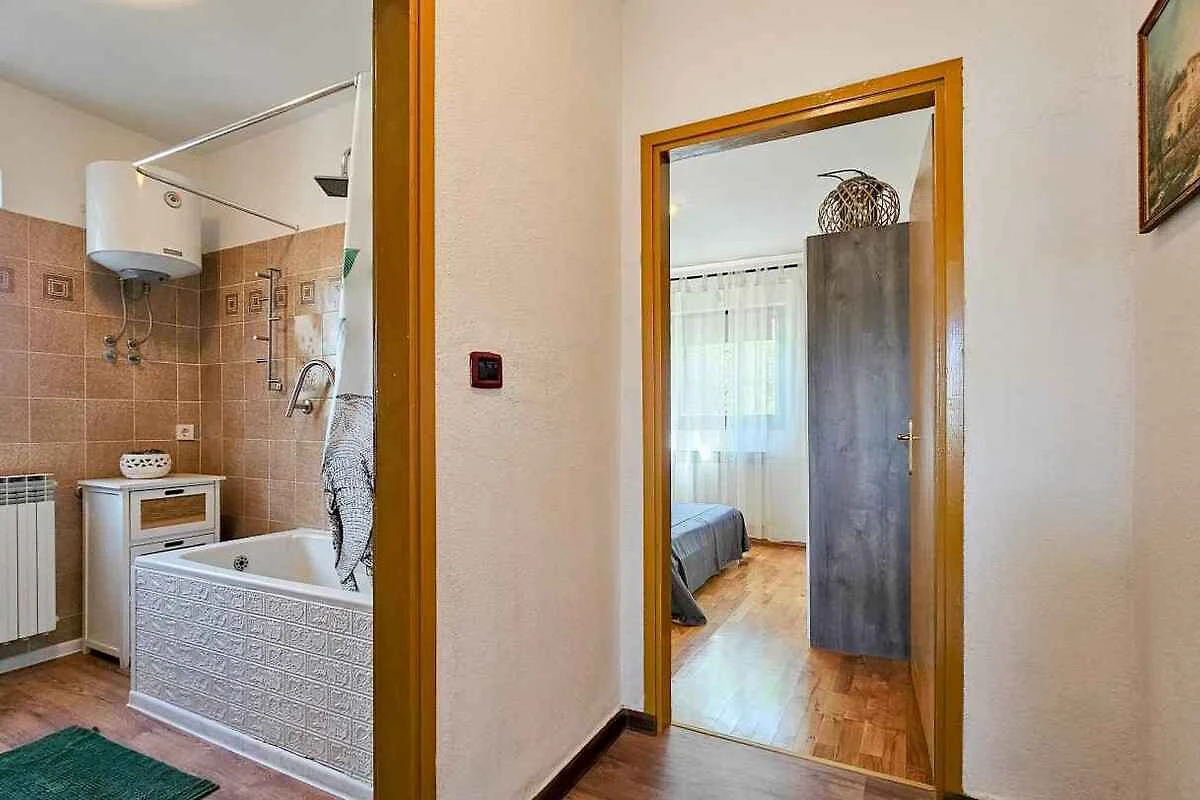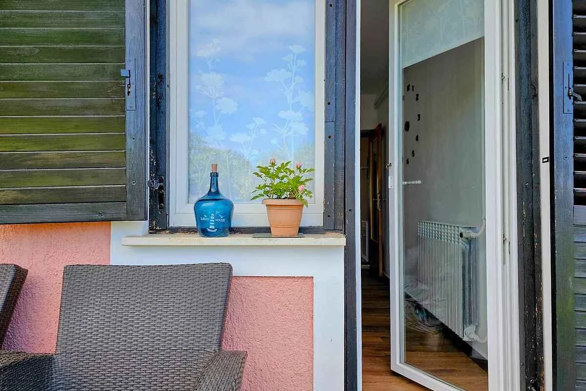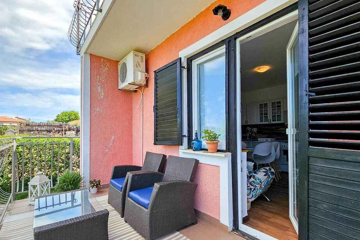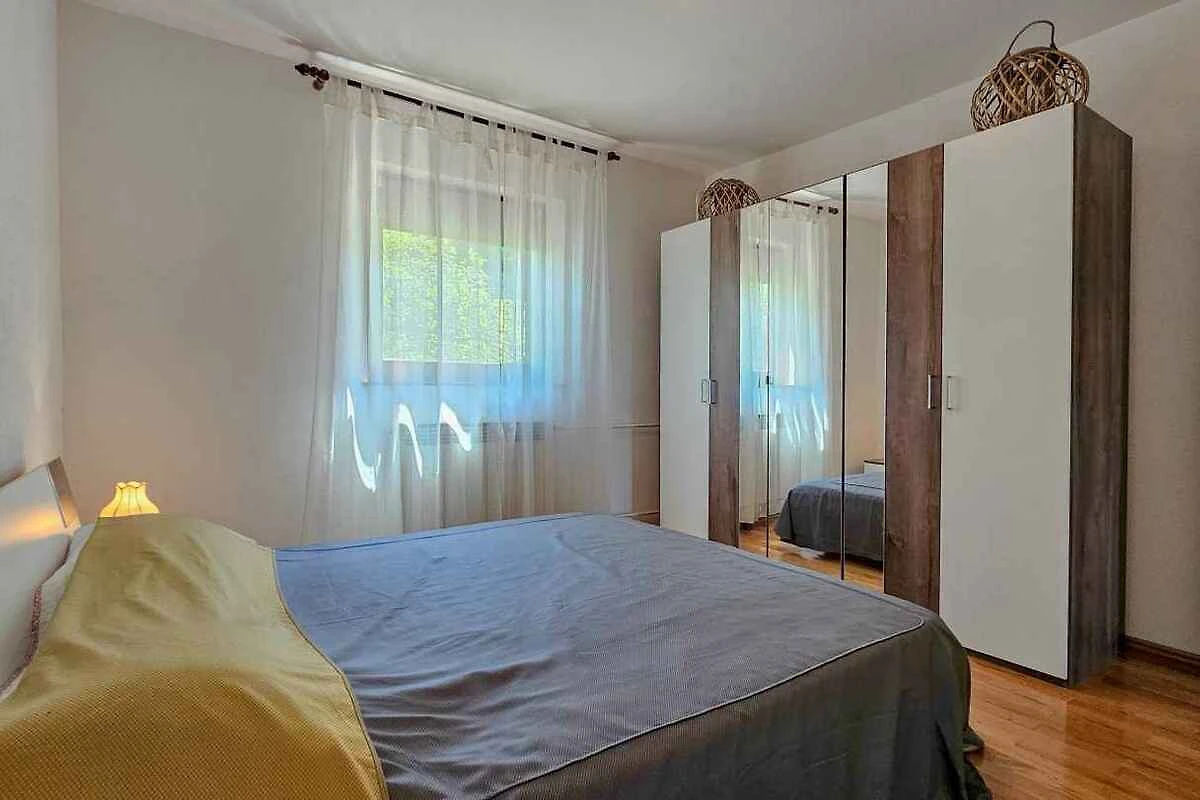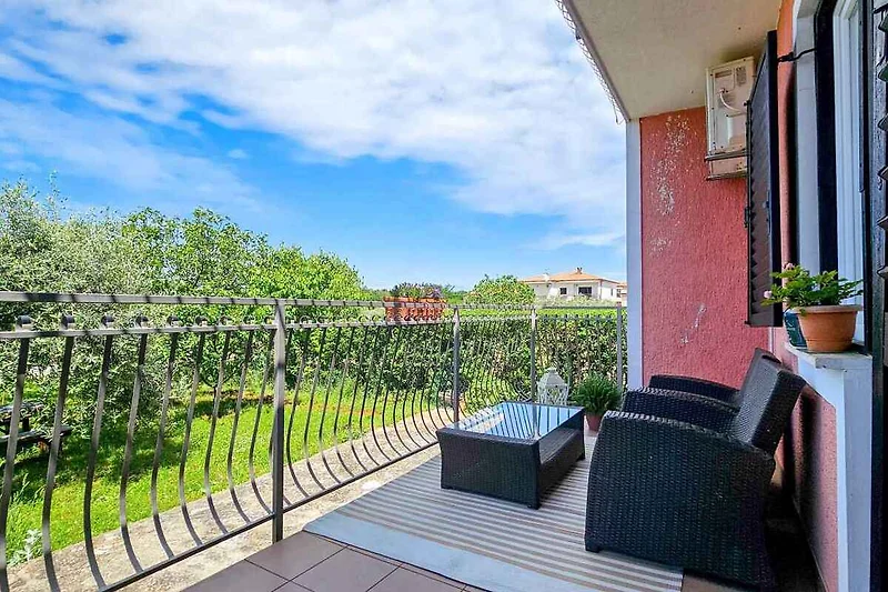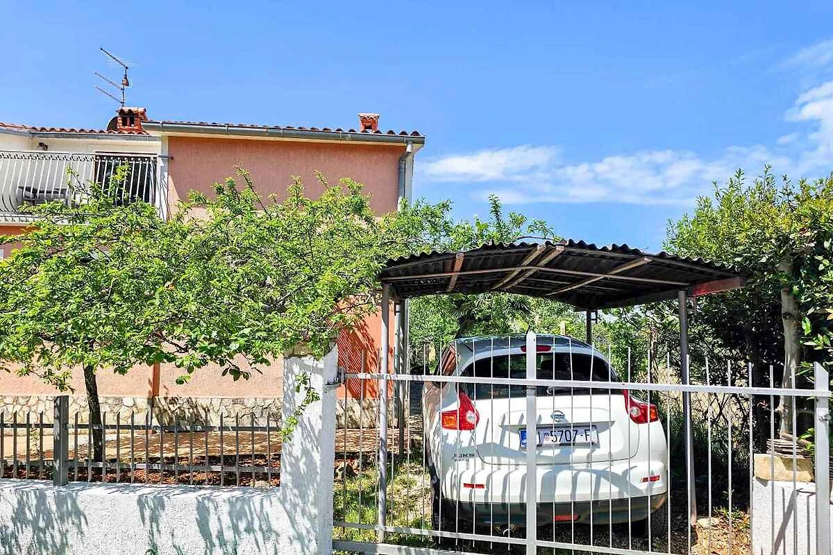 Novigrad. Die Ferienwohnung befindet sich auf einem geschlossenen Gartengrundstück mit Bäumen, von einem Zaun begrenzt. Der Vermieter wohnt ständig im Haus, nutzt jedoch einen separaten Eingang. Die Zufahrt erfolgt über eine Nebenstrasse (asphaltiert). Parkplatz (für 1 Pkw) auf dem Grundstück.
