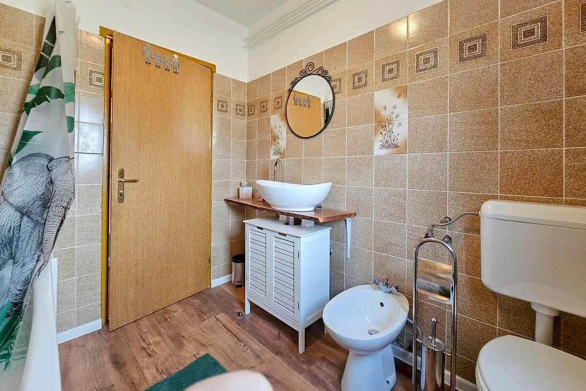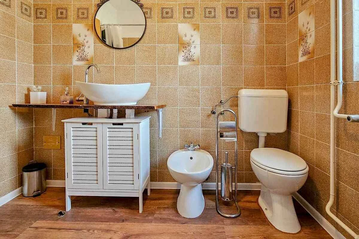 Der Eingang in Ihre Ferienwohnung befindet sich in Hochparterre und führt über eine Aussentreppe und den Balkon direkt in die Wohnküche. Wohnzimmer (Durchgangszimmer) mit TV und Zugang zum Balkon (Gartenmöbel, 1 Tisch, 2 Stühle). Schlafzimmer mit 1 Doppelbett. Küche in der Wohnküche (Durchgangszimmer) mit Essecke (4 Plätze), Elektroherd (4 Platten), Backofen, Kühlschrank (Eisfach) und Zugang zum Balkon. Bad mit Badewanne, 1 Waschbecken, WC, Bidet und Fenster.