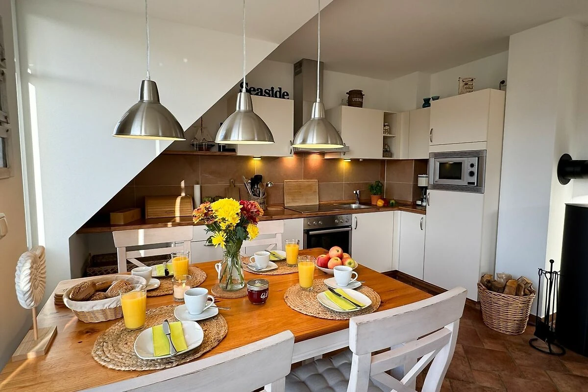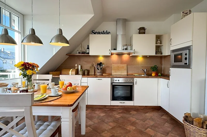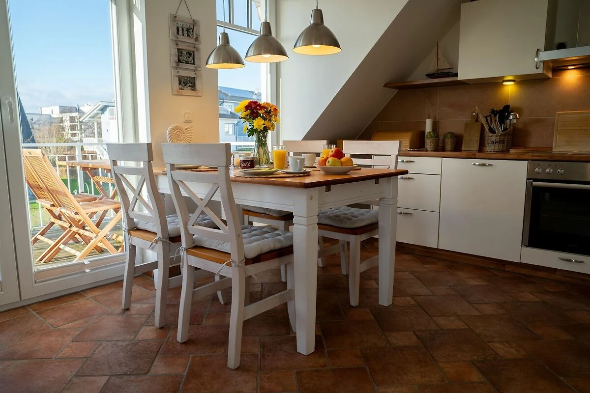 Die offene Küche verfügt über einen grossen Esstisch für vier Personen. Hier können Sie gemeinsame Mahlzeiten geniessen und gemütliche Abende verbringen.