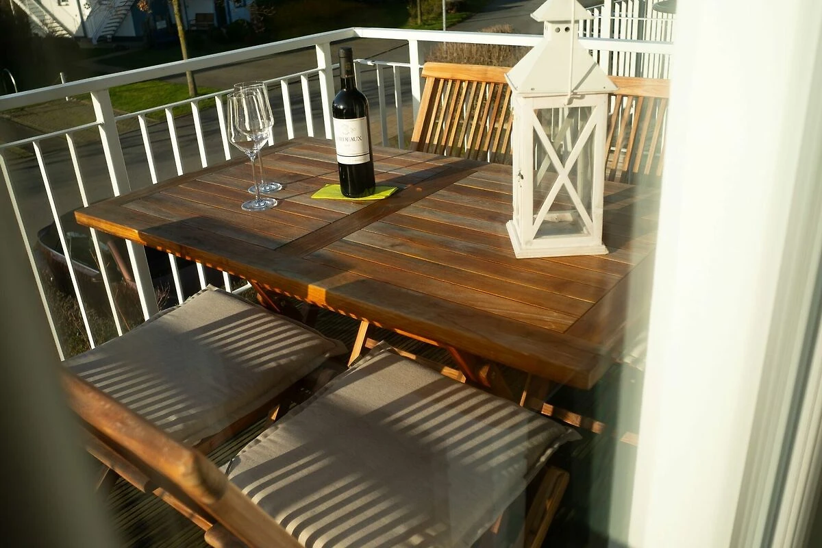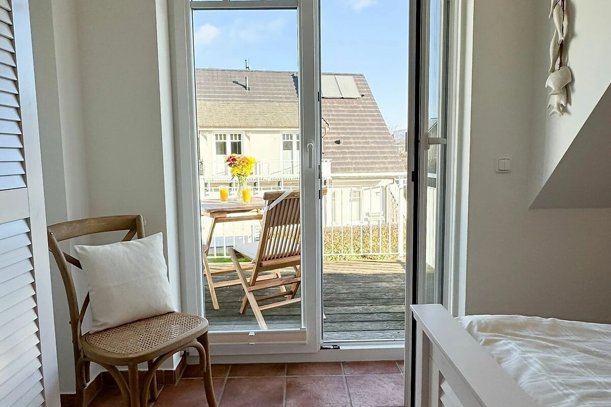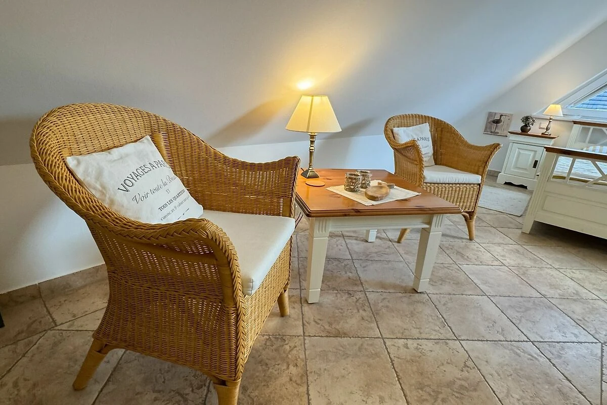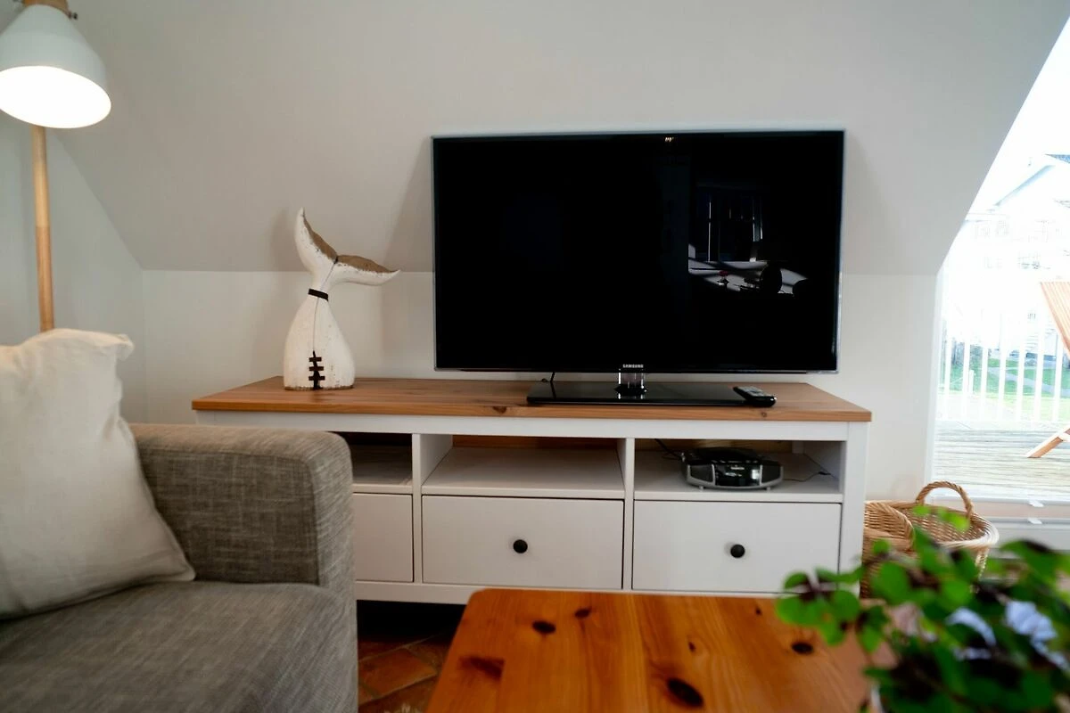 Die Wohnung verfügt über zwei Balkone mit Balkonmöbeln für vier Personen. Sie können hier die frische Meeresluft geniessen und entspannte Stunden im Freien verbringen. Die Einrichtung ist mit hochwertigen Naturholzmöbeln gestaltet, was eine warme und gemütliche Atmosphäre schafft. Eine Fussbodenheizung sorgt dafür, dass Sie auch in den kälteren Monaten stets angenehme Wärme haben. Der Wohnbereich ist mit einer gemütlichen Couch und einem HD-TV ausgestattet. Von hier aus haben Sie Zugang zu einem der Balkone.