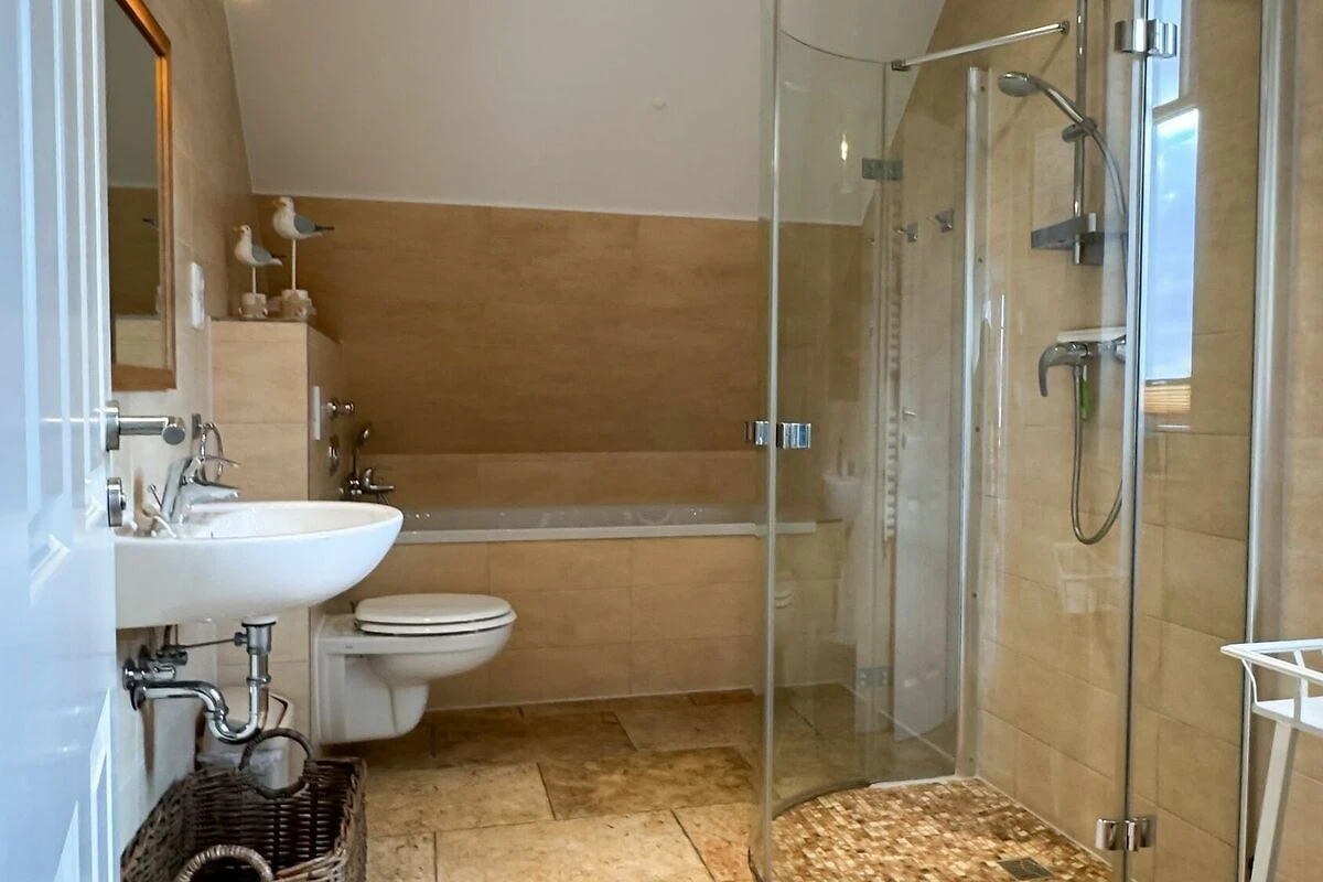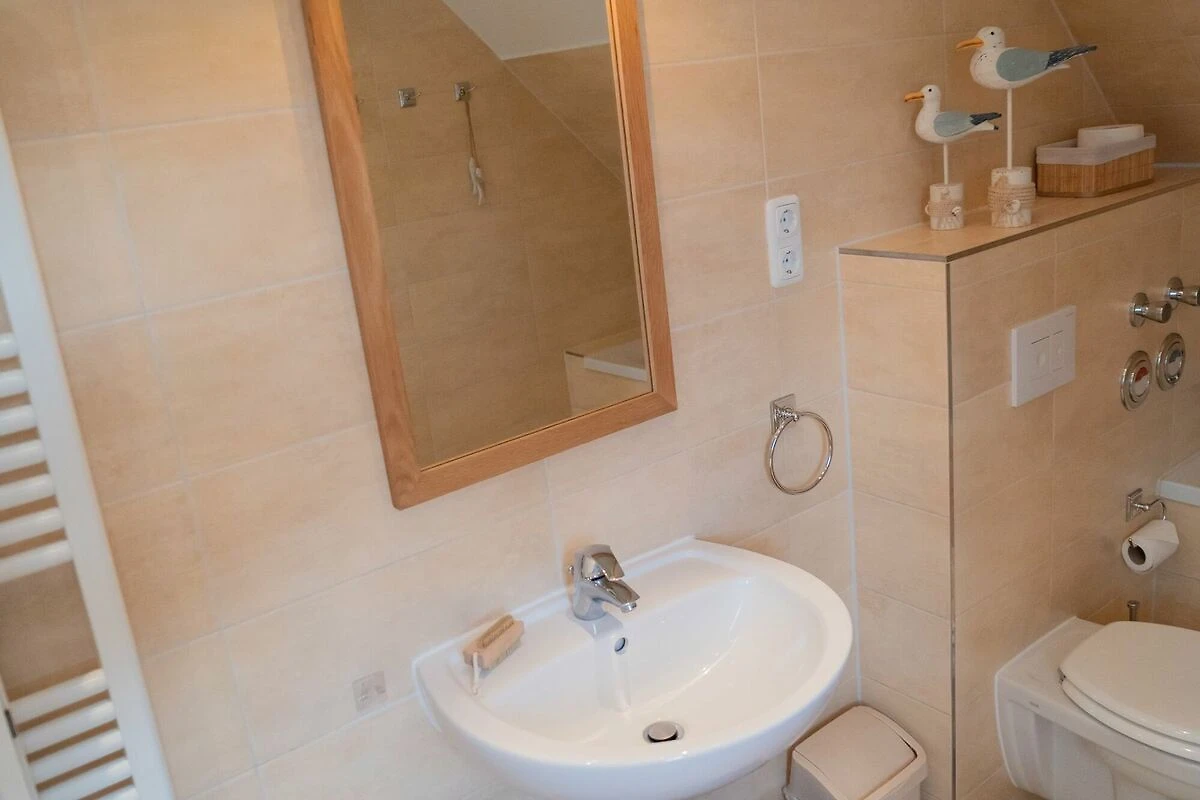 Das Tageslichtbad ist mit einer Badewanne und einer bodenebenen Dusche ausgestattet. Hier können Sie sich erfrischen und entspannen. Ein Wäscheständer ist ebenfalls vorhanden.