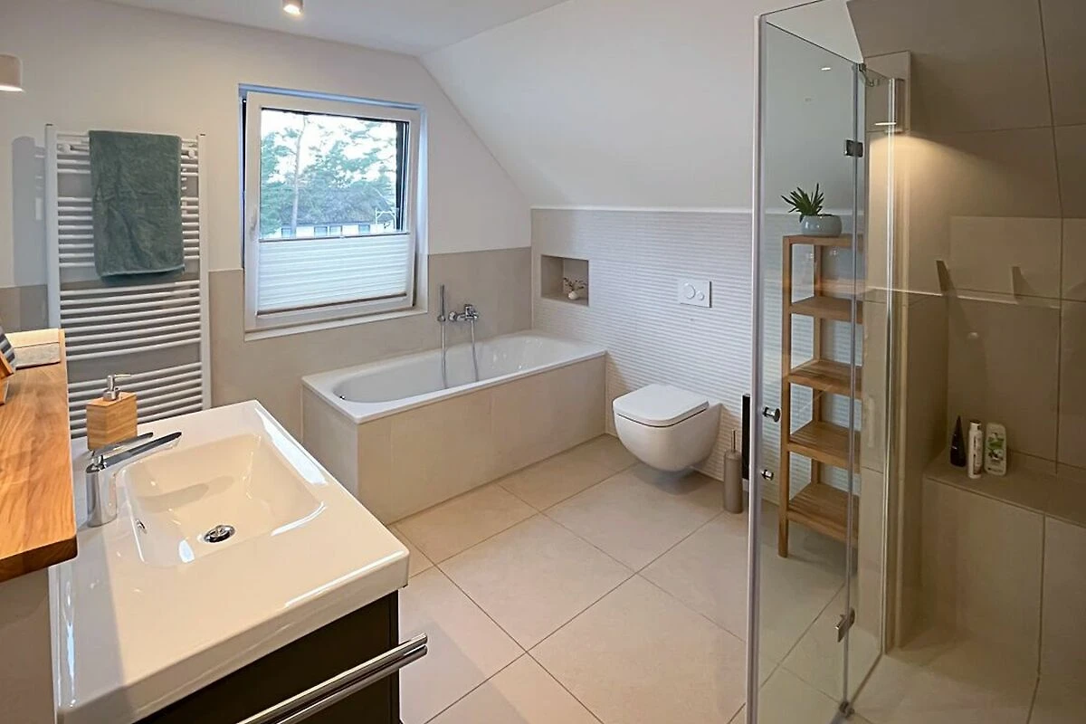 Im Badezimmer erwarten Sie verschiedene Annehmlichkeiten, darunter ein Föhn, WC, Dusche, Badewanne und ein Waschbecken. Der Kosmetikspiegel ergänzt die praktische Ausstattung, während Fussbodenheizung und Fliegengitter eine angenehme Umgebung schaffen. Auch ein separater WC-Bereich ist vorhanden, ebenfalls ausgestattet mit Föhn, WC, Waschbecken und Fussbodenheizung. Spiegel vervollständigen das funktionale Design.