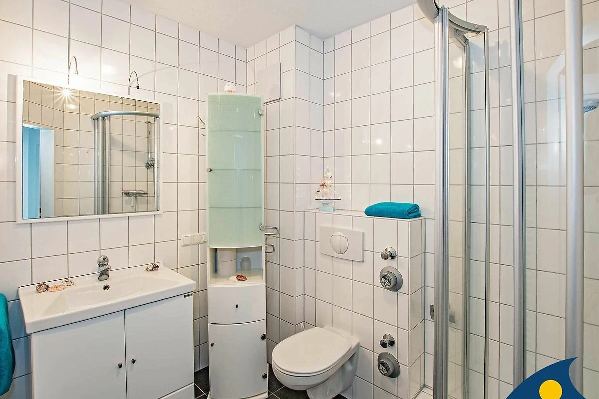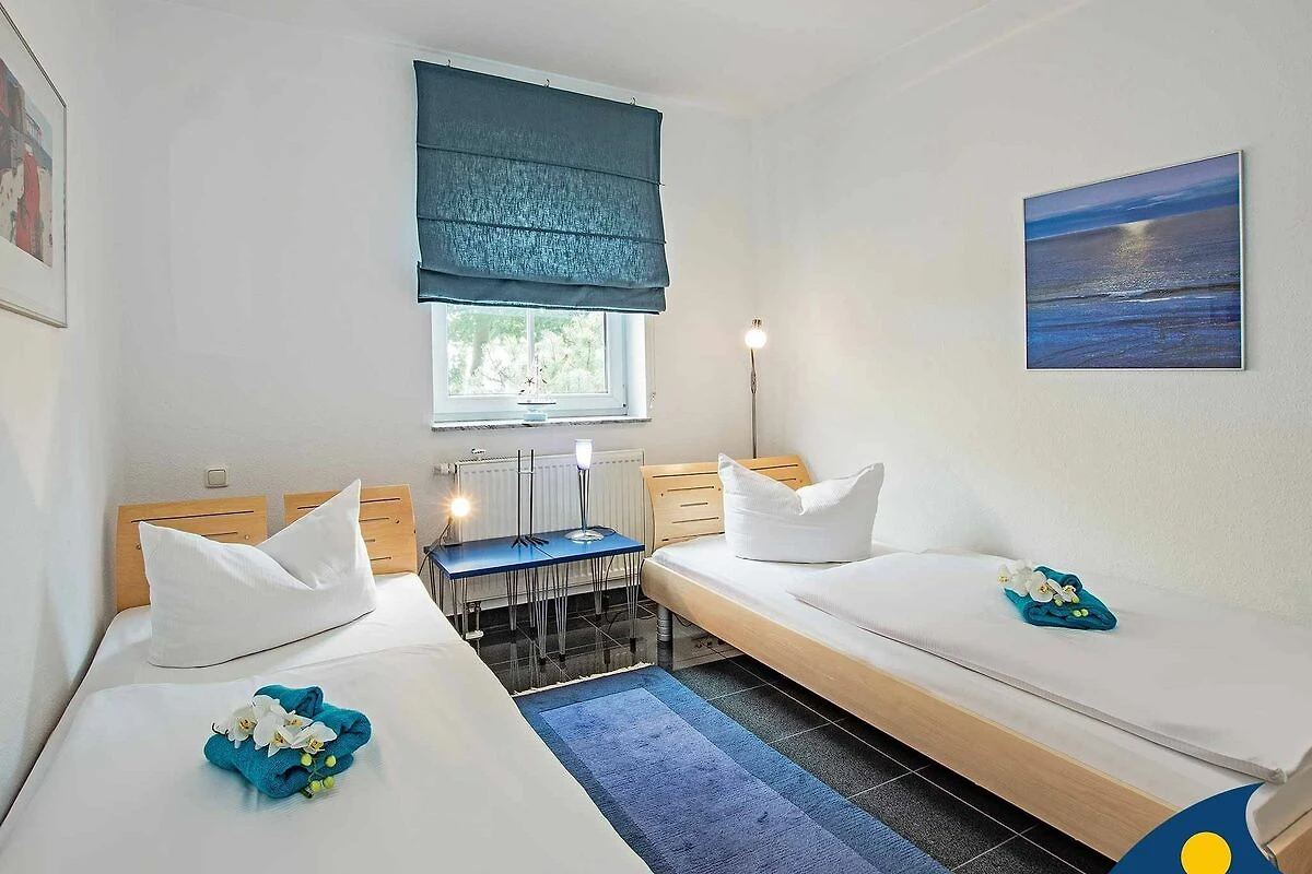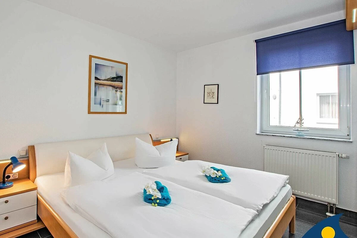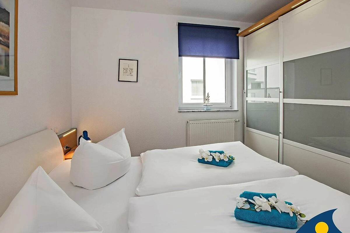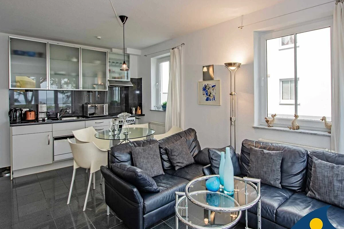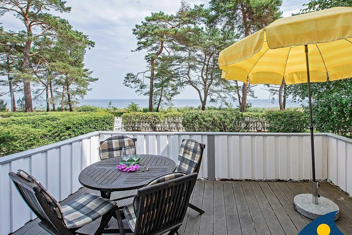 Dieses moderne Dreiraumappartement in der 2. Etage (auf Ebene der Strandpromenade) wurde mit hochwertigen Möbeln (z. B. einer Benz-Ledercouch) und Granitfussböden in allen Zimmern exklusiv ausgestattet. Zur Badausstattung gehört eine Ganzglasdusche. Die Wohnung verfügt über 2 Fernseher und eine Stereoanlage mit CD-Player. Die Holzterrasse, die an das Wohnzimmer grenz, bietet einen traumhaften Blick über das Meer.