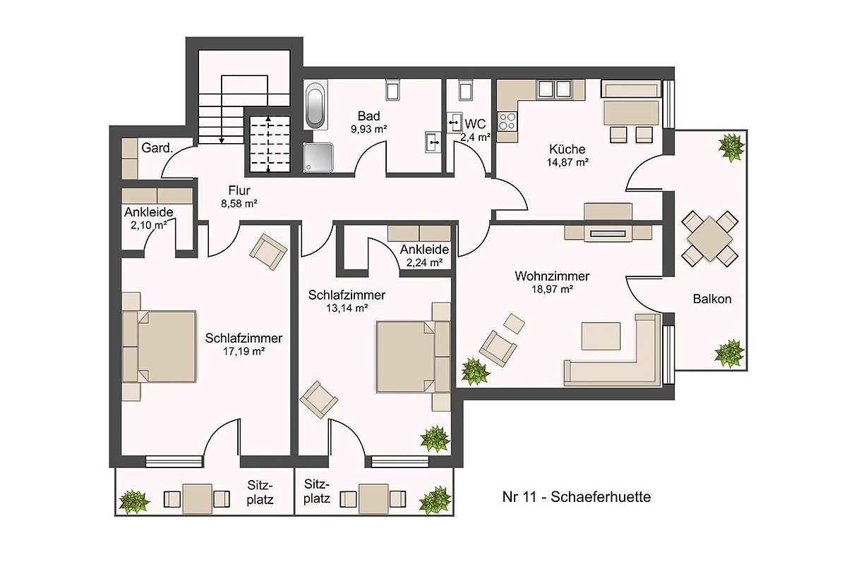 Zur Ferienwohnung Schäferhütte gelangen Sie über einen abgeschlossenen Aufgang. Durch die Zirbenholzbetten ist eine erholsame Nacht nach einem aufregenden Allgäuer Erlebnistag schon fast garantiert. Besonders die Ankleidezimmer in den beiden Schlafzimmern, die drei Balkone und die freistehende Badewanne machen die Schäferhütte zu einem ganz besonderen Feriendomizil.