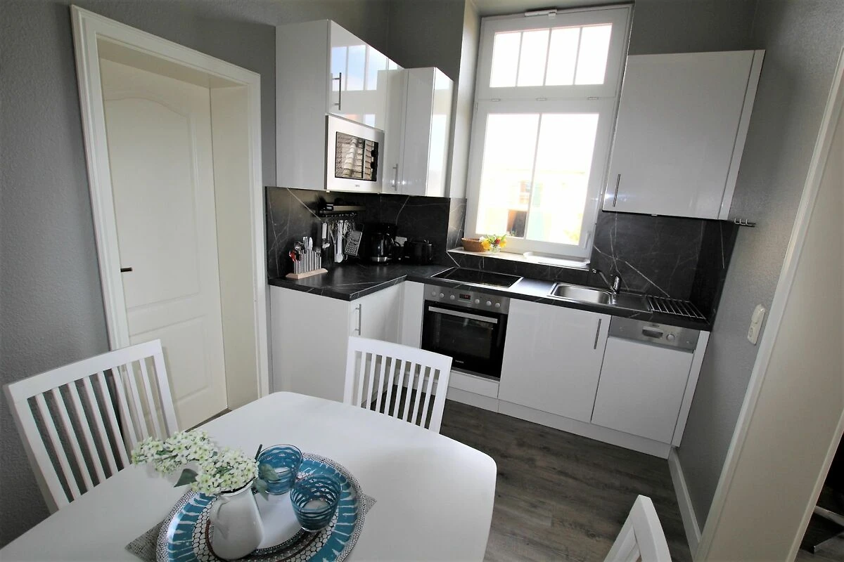Die kleine Küche ist standardmäßig ausgestattet mit einem Geschirrspüler, einem Backofen, einer Microwelle und einem Kühlschrank.