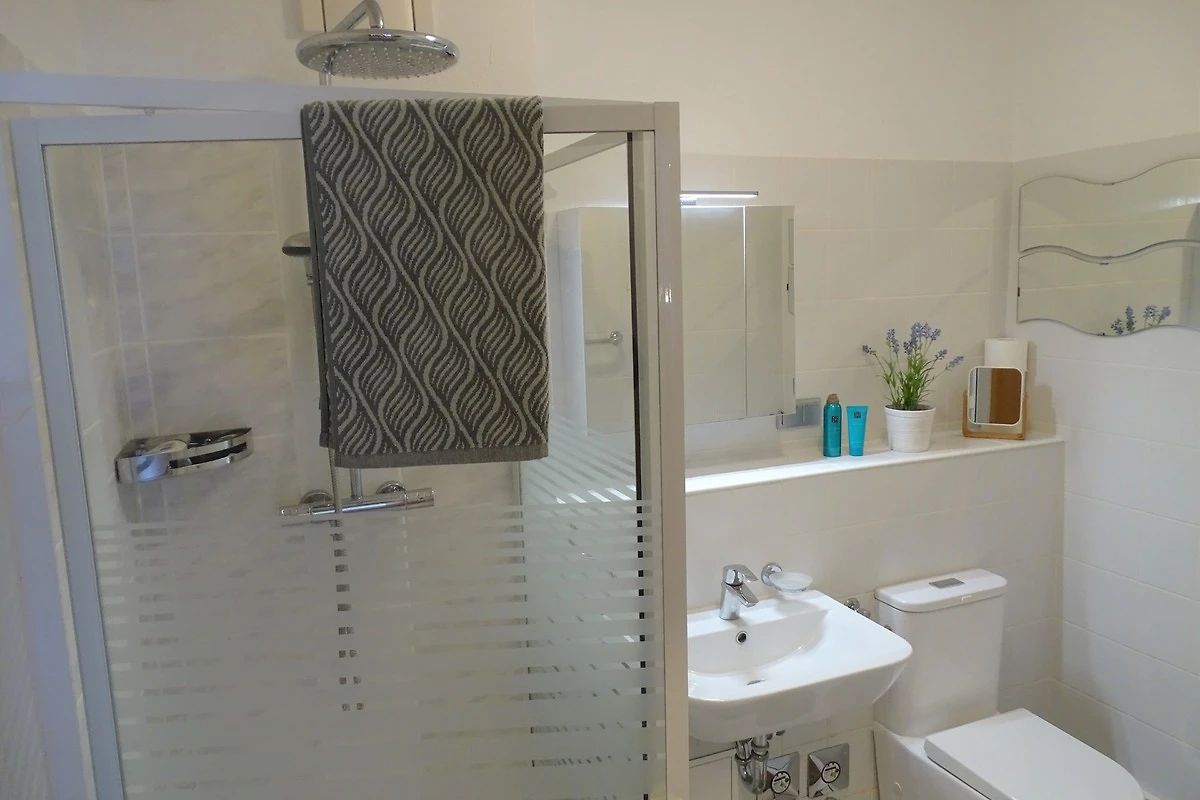 Den Mittelpunkt der Wohnung bildet der offene Wohn-/Ess- und Kochbereich. Hier trifft sich die Familie auf der grossen gemütlichen Couch mit Flachbild-TV oder am Esstisch zum gemeinsamen Spielen. Loggen Sie sich über den kostenlosen WLAN-Anschluss ein, um auch im Urlaub erreichbar zu bleiben. In der gut ausgestatteten Küche können Sie Ihre Lieben mit selbst zubereiteten Köstlichkeiten versorgen. Auf der eigenen möblierten Terrasse hören und riechen Sie das Meer! Im Hauptschlafzimmer mit bequemem Doppelbett (2x 90x200 cm) und Kleiderschrank können Sie sich nach einem ereignisreichen Urlaubstag erholen und Kraft für den neuen Tag tanken. Das 2. Schlafzimmer beinhaltet 2 Einzelbetten ( 90 x 200 ) , mit Kleiderschrank und einem zusätzlichen TV-Gerät. Das hell geflieste Duschbad komplettiert die Ausstattung dieser schönen Ferienwohnung und verfügt sogar über eine Waschmaschine.