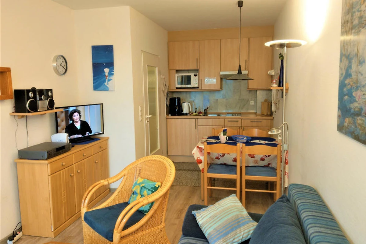 Radio und CD-Player. Komplett eingerichtete Küche mit Kühlschrank incl. Tiefgefrierfach, 2 Platten - Ceran-Kochfeld, Dunsthaube, Wasserkocher, Eierkocher, Kaffeemaschine, Toaster ..