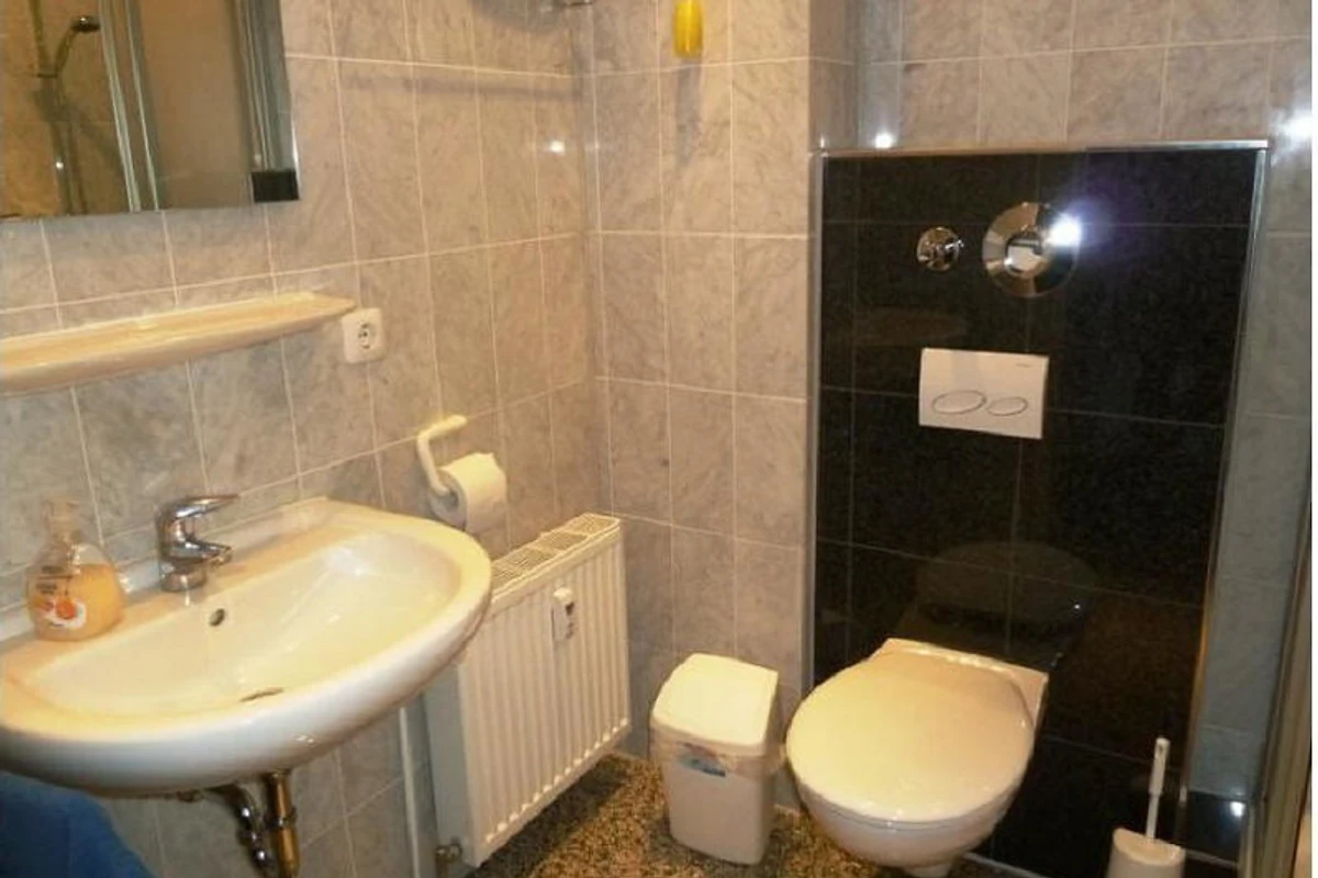 Modern eingerichtetes Bad mit Marmorfliesen. Schlaf- und Wohnzimmer ab März 2020 mit Vinylböden.