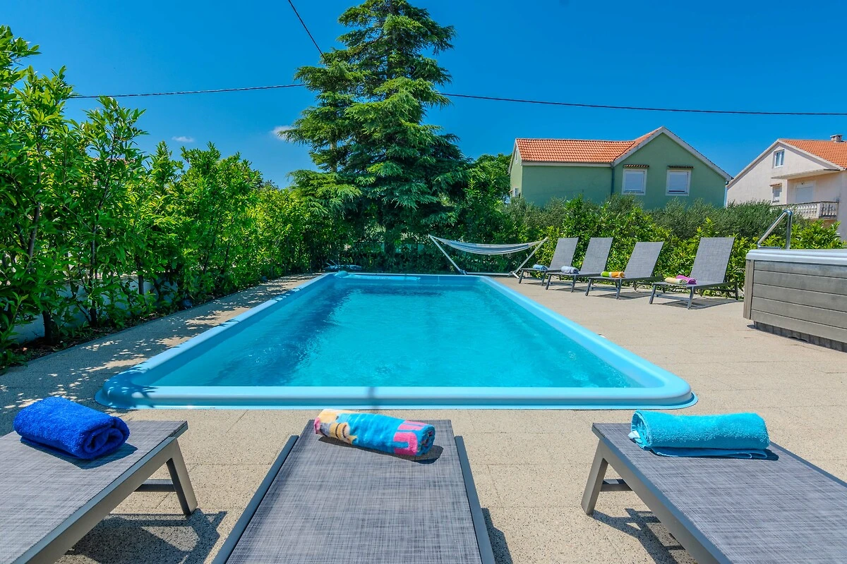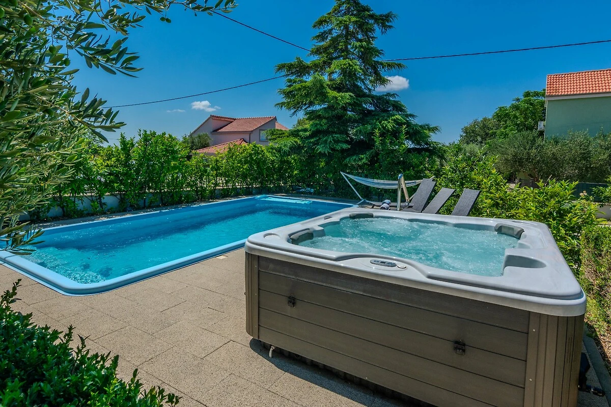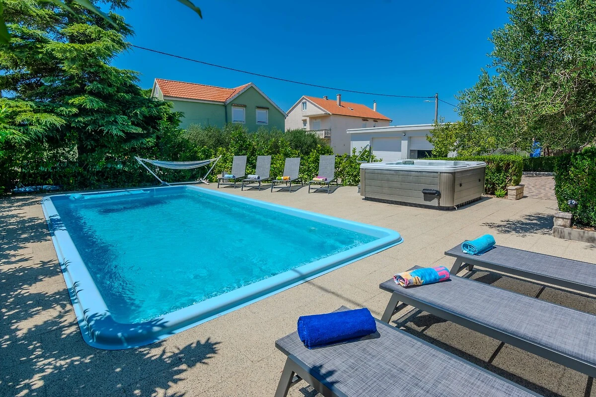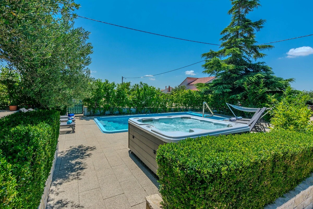 Willkommen im Holiday House Lavanda in Zemunik Gornji, Dalmatien – der perfekte Ort für Ihren Familienurlaub! Hier genießen bis zu 10 Gäste auf 140 m² Wohnfläche Komfort und Privatsphäre in fünf Schlafzimmern und zwei Badezimmern. Die großzügige Terrasse mit Balkon lädt zu entspannten Stunden ein, während der Swimmingpool und der Whirlpool für Erfrischung und Erholung sorgen. Für gesellige Abende steht Ihnen ein BBQ-Grill zur Verfügung.