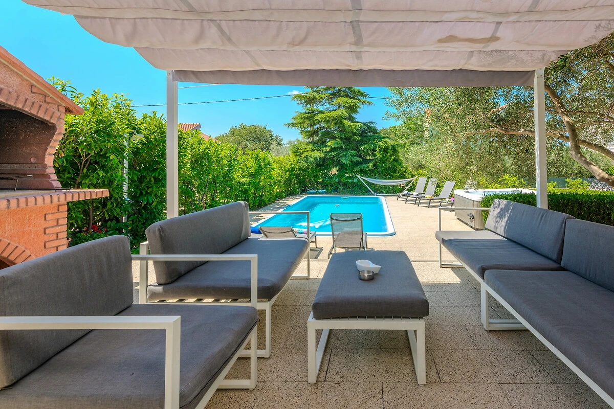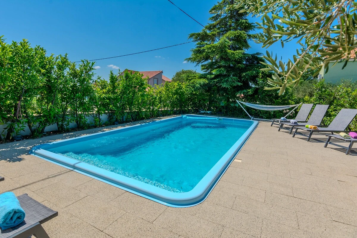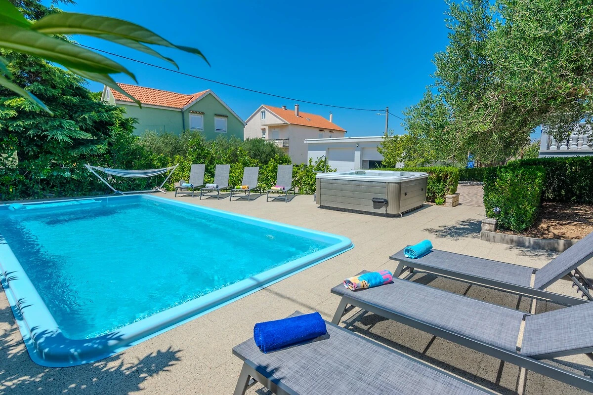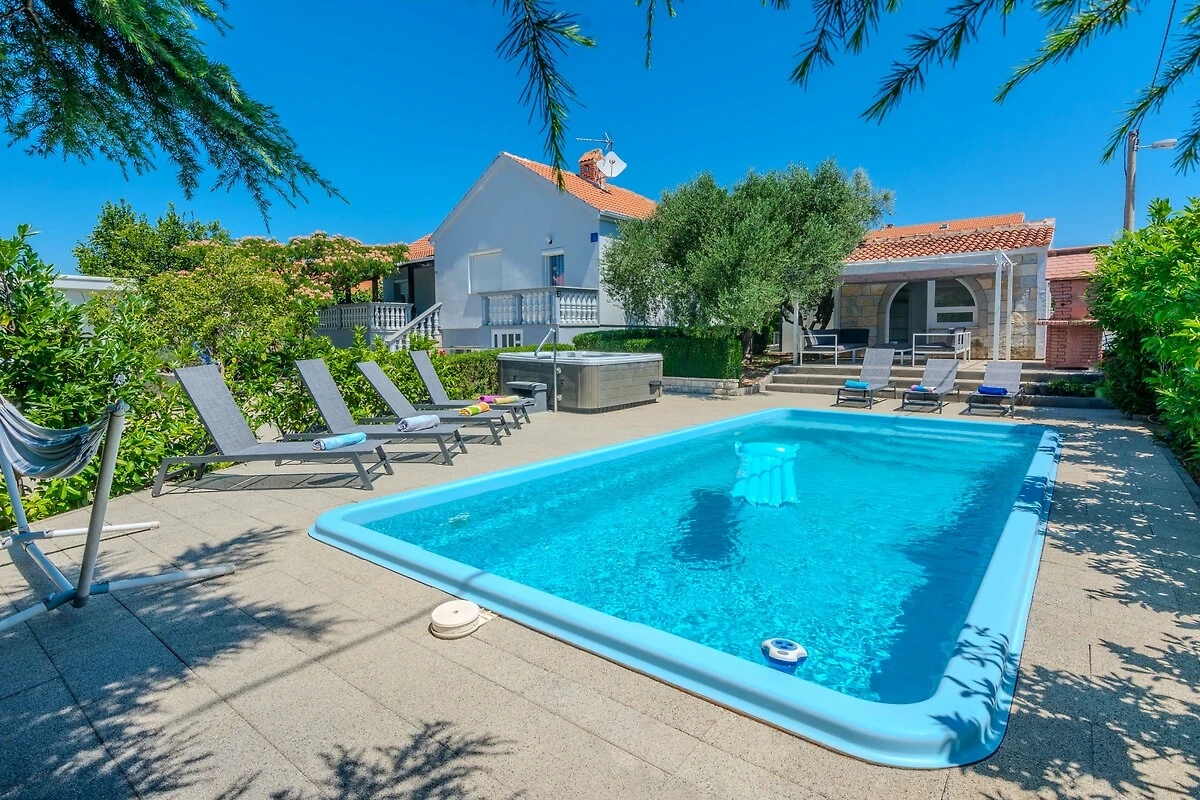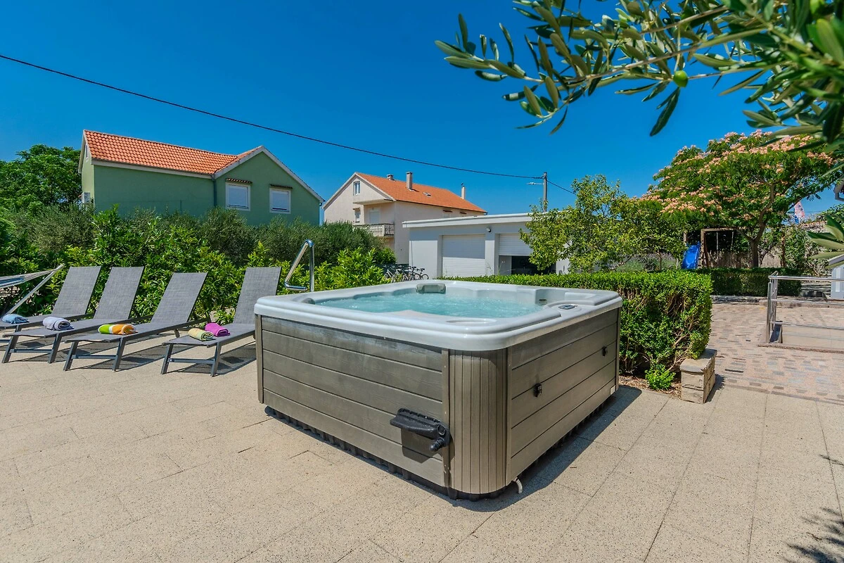 Willkommen im Holiday House Lavanda in Zemunik Gornji, Dalmatien – der perfekte Ort für Ihren Familienurlaub! Hier genießen bis zu 10 Gäste auf 140 m² Wohnfläche Komfort und Privatsphäre in fünf Schlafzimmern und zwei Badezimmern. Die großzügige Terrasse mit Balkon lädt zu entspannten Stunden ein, während der Swimmingpool und der Whirlpool für Erfrischung und Erholung sorgen. Für gesellige Abende steht Ihnen ein BBQ-Grill zur Verfügung.