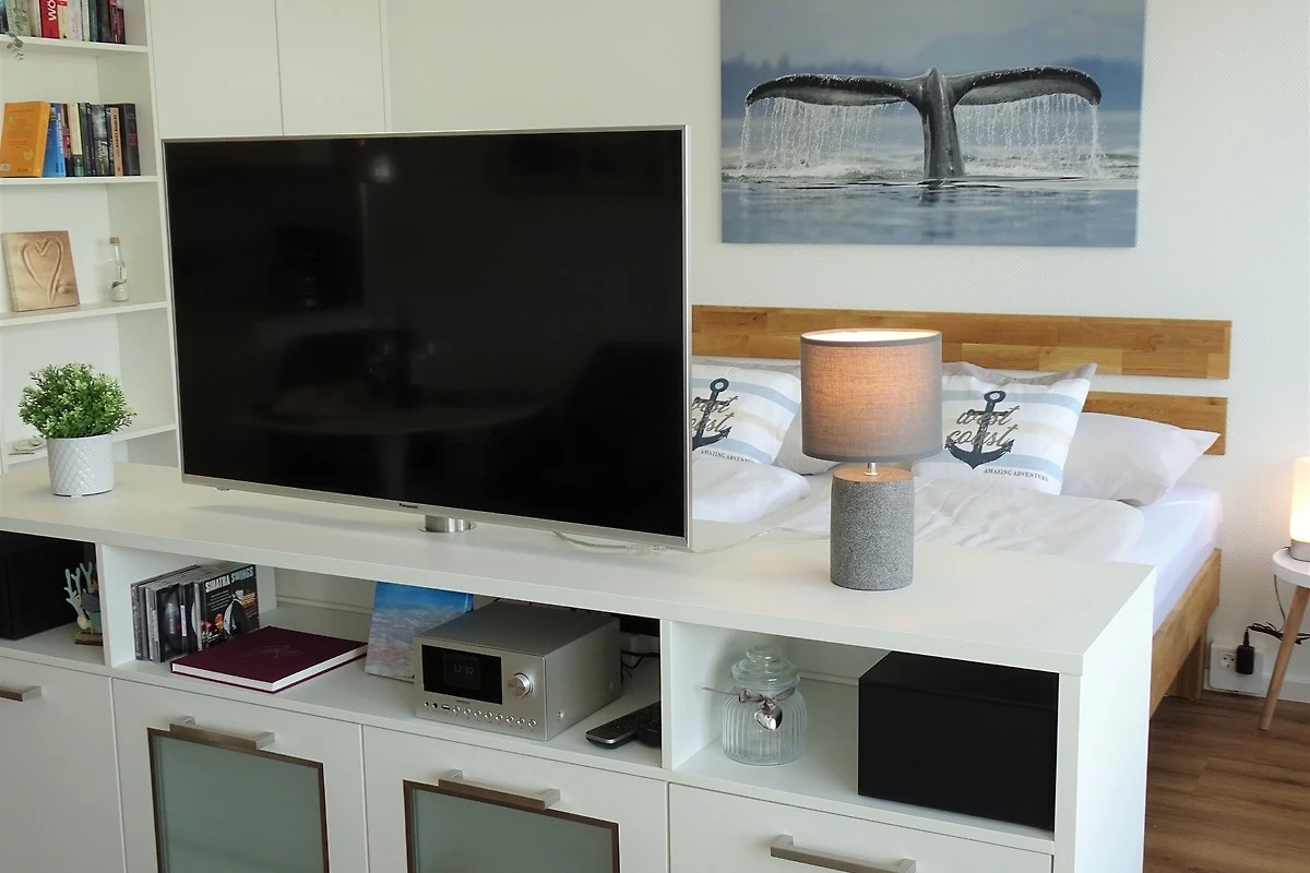 Zwischen Küche und Wohnzimmer gibt es einen Essplatz für 2 Personen. Das gemütliche Sofa mit Leselampe lädt zum Verweilen ein. Eine Vitrine mit TV (43 Zoll) und Stereo-Anlage dient als Raumteiler. Der TV ist drehbar so dass Sie bequem vom Sofa oder auch vom Bett fernsehen könnten. Das Doppelbett hat eine Grösse von 1,60 x 2,00, die Matratzen-Seiten haben unterschiedliche Härtegrade. Die Einbauschränke bieten reichlich Platz für Staubsauger, Besen & Co, sowie für Ihre Kleidung. Der Balkon ist mit Tisch und Stühlen, Sonnenschirm und Schirmständer ausgestattet. Hier können Sie den Tag in der Abendsonne ausklingen lassen.
