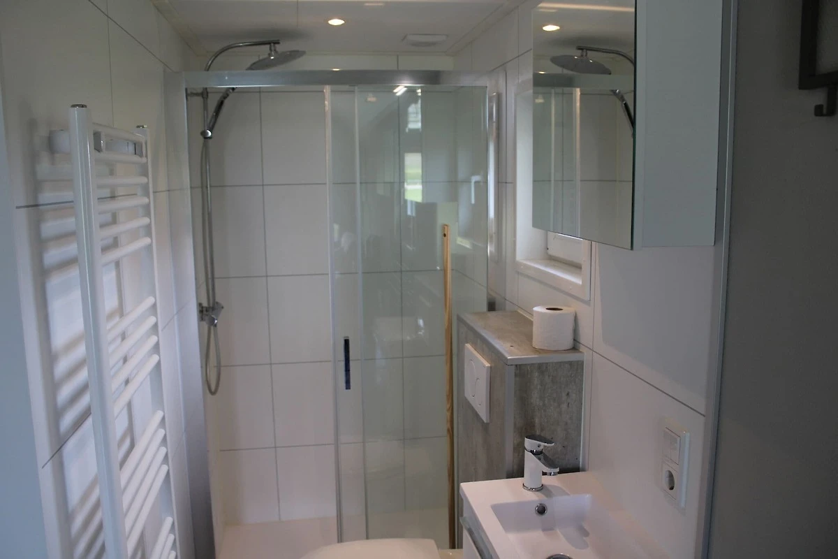 Parterre: (Wohnzimmer(TV), offene Küche(Wasserkocher, Kochherd, Kaffeemaschine, Spülmaschine, Kühlschrank(+ Gefrierfach)), Schlafzimmer(Einzelbett, Einzelbett), Badezimmer(Dusche, Waschbecken, Toilette), Empore(Doppelbett))