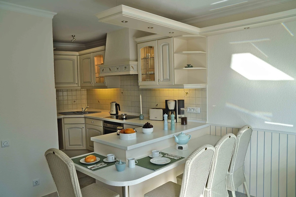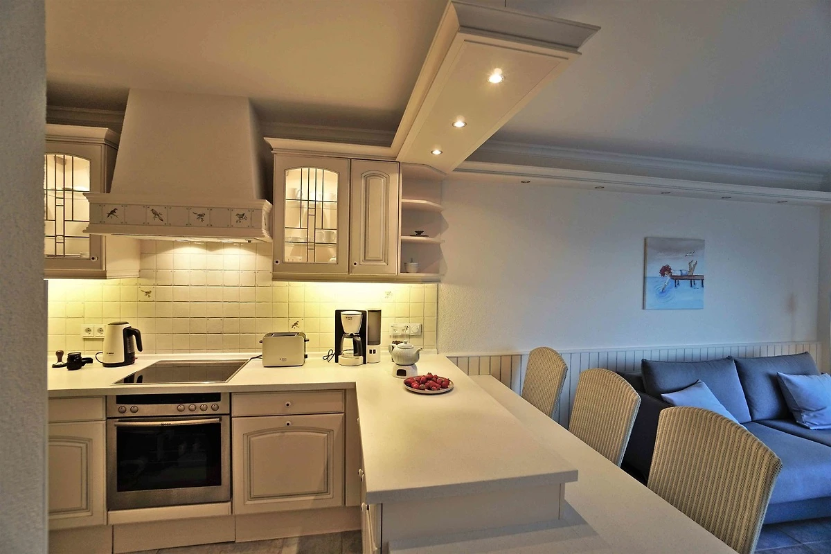 Die weisse Friesen-Küche verfügt über einen Backofen, Cerankochfeld, Spülmaschine, Kühlschrank, Gefrierschrank, diverse Elektrokleingeräte sowie viel Stauraum.