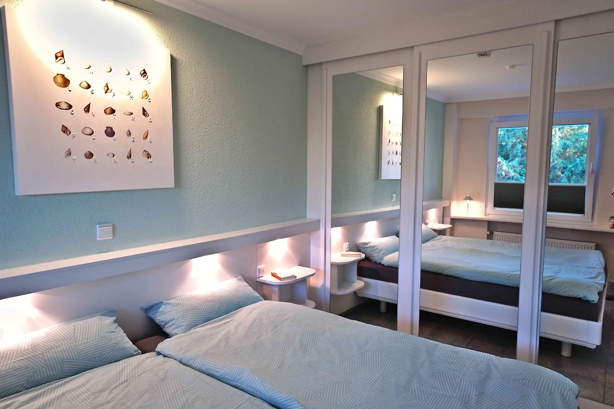 Im Schlafzimmer finden Sie ein Doppelbett (180 x 200cm) und einen grossen Einbaukleiderschrank mit Ganzkörperspiegel vor. Higlight ist das an das Schlafzimmer angrenzende "Bad en suite". Hier finden Sie eine grosse Runddusche, WC und Waschbecken sowie einen Handtuchheizkörper vor.