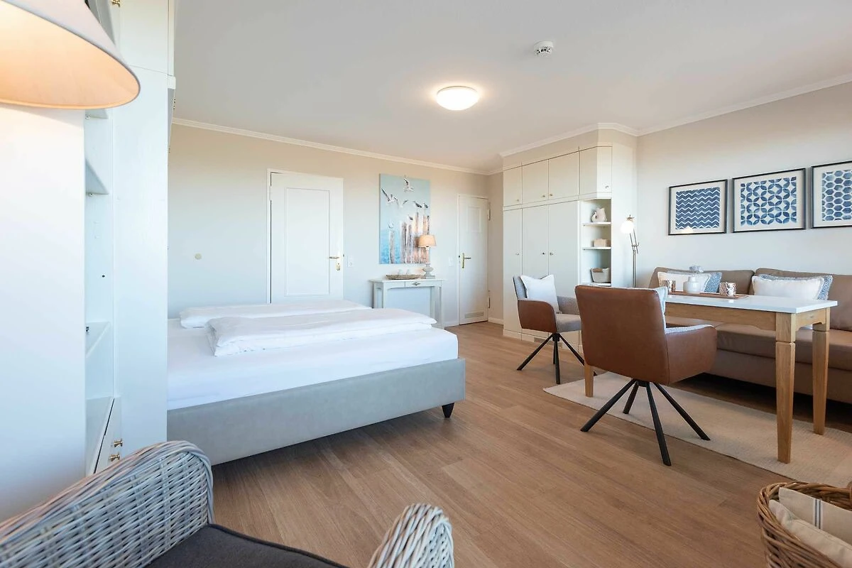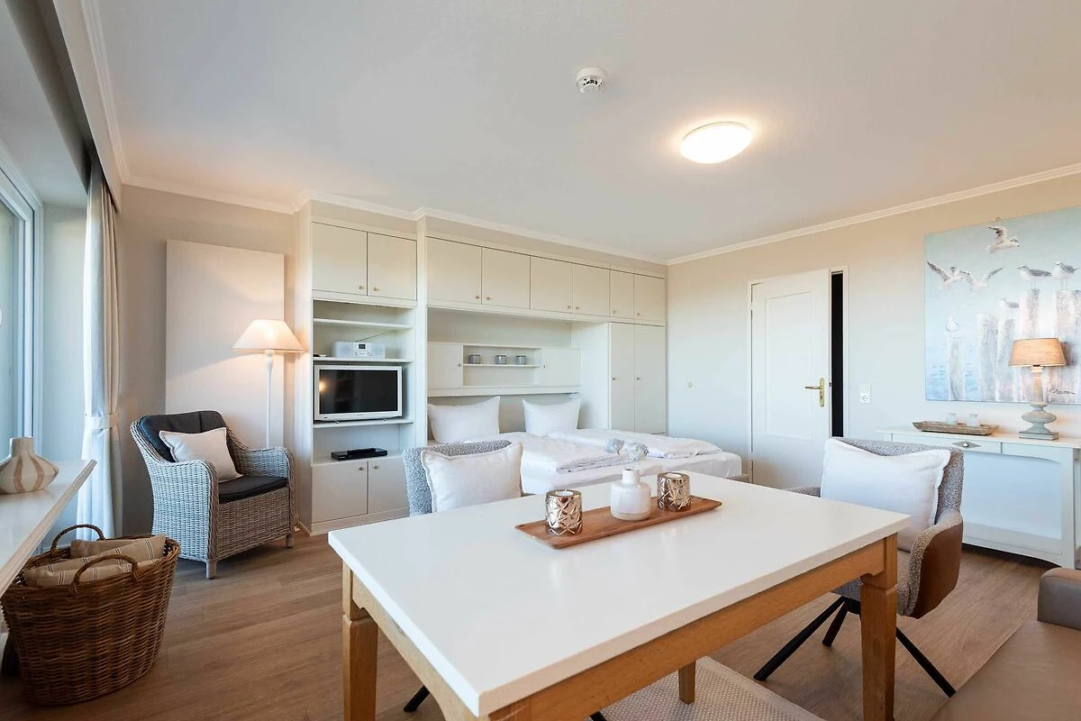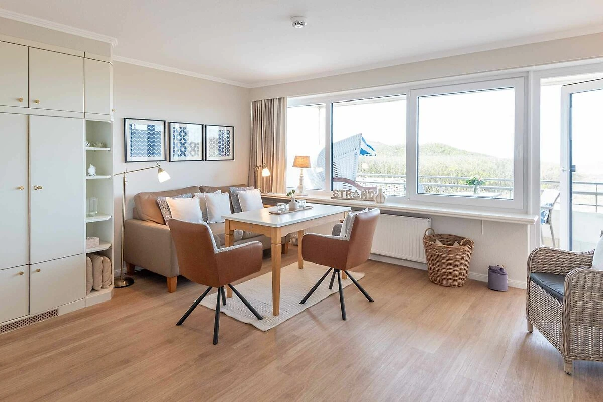Wohn-/Ess- und Schlafbereich: Im Mittelpunkt des hellen Wohnraums steht ein gemütliches Sofa mit großem Esstisch und zwei bequemen Stühlen. Hier können Sie beim Essen und Lesen entspannte Stunden erleben und auf die Nordsee schauen. Flat-TV, Radio und Blue Ray Player stehen für Gäste zur Verfügung. In die Schrankwand im Wohnzimmer ist ein neues Doppelbett (März 2025) mit hochwertigen Matratzen (zwei 90 cm x 200 cm) integriert. Von Ihrem großzügigen möblierten Westbalkon mit Saison-Strandkorb blicken Sie direkt auf das Meer und genießen herrliche Sonnenuntergänge.