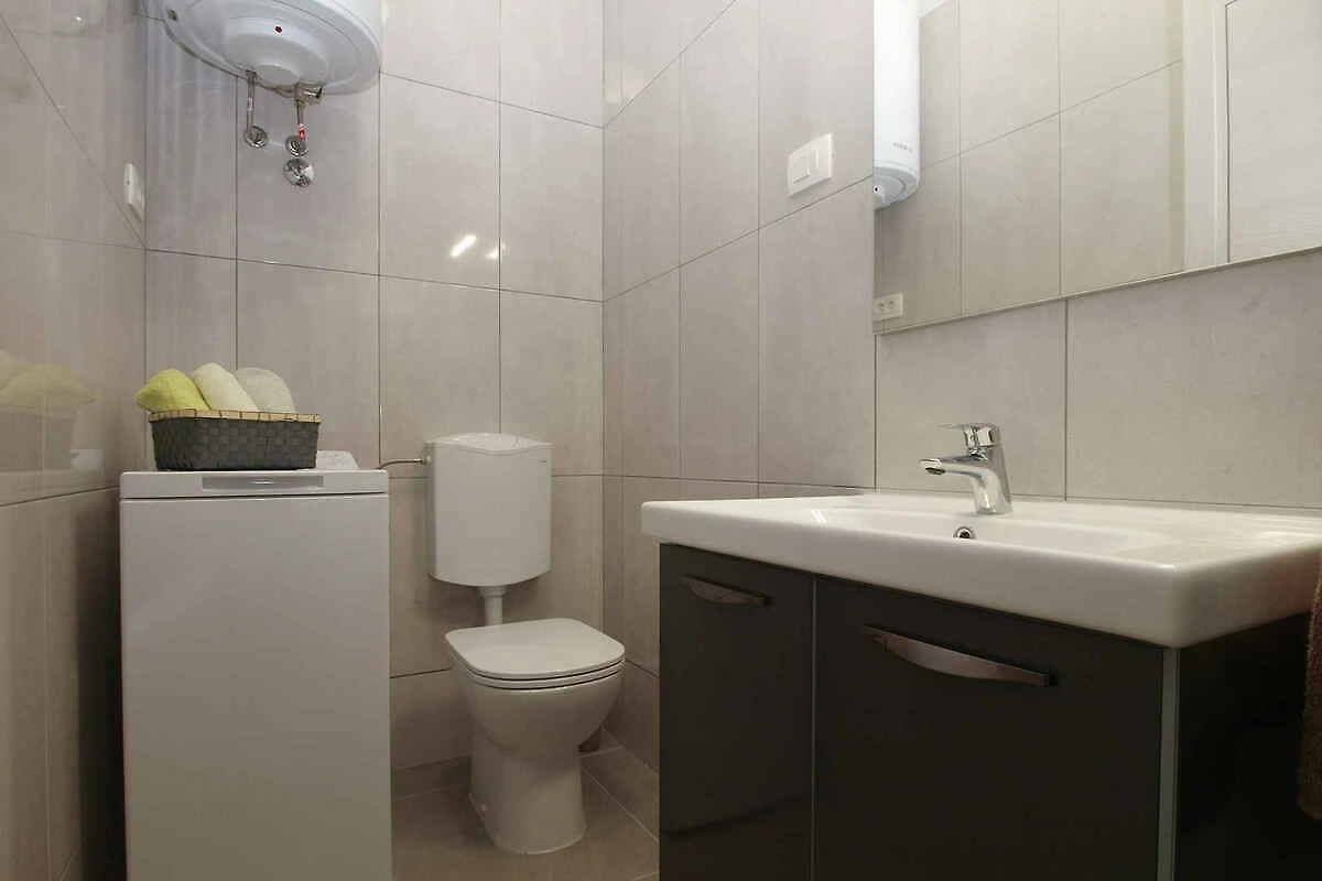 . Wohnzimmer mit 1 Zusatzbett auf Couch/Sofa und TV. 2 Schlafzimmer jeweils mit 1 Doppelbett. Küche (8 qm) mit Gasherd, Geschirrspüler, Kühlschrank (Eisfach), Mikrowelle, Kaffeemaschine und elektrischem Wasserkocher. Bad (4 qm) mit Waschmaschine, Dusche und 1 Waschbecken.
