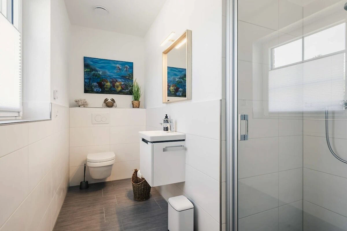 Zusätzlich zu den Schlafzimmern finden Sie in unserem Ferienhaus auch zwei moderne Badezimmer. Diese sind mit Duschen, eins zusätzlich mit einer Badewanne und Sauna ausgestattet und bieten Ihnen den Komfort, den Sie während Ihres Aufenthalts benötigen.