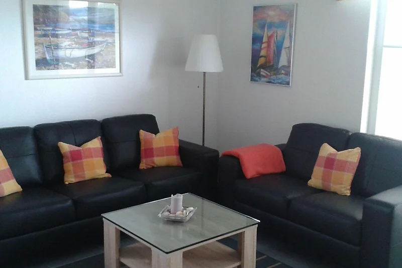 Im grosszügigen Wohnzimmer befinden sich neben einer gemütlichen Sitzecke mit zwei Sofas auch ein grosser Esstisch und die gut ausgestattete Einbauküche. Sie verfügt über Geschirrspüler, Kühl-/Gefrierkombination, Cerankochfeld, Backofen, Mikrowelle, Kaffeemaschine, Toaster und Wasserkocher. Flachbildfernseher und Stereoanlage sind zu Ihrer Kurzweil selbstverständlich ebenfalls vorhanden. Der Balkon liegt in südwestlicher Richtung und lädt zum Sonnenbaden und Frühstücken ein.