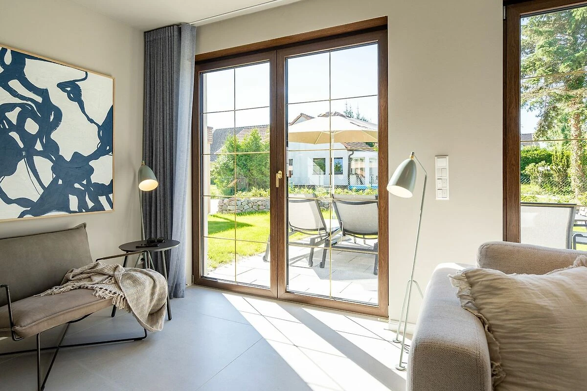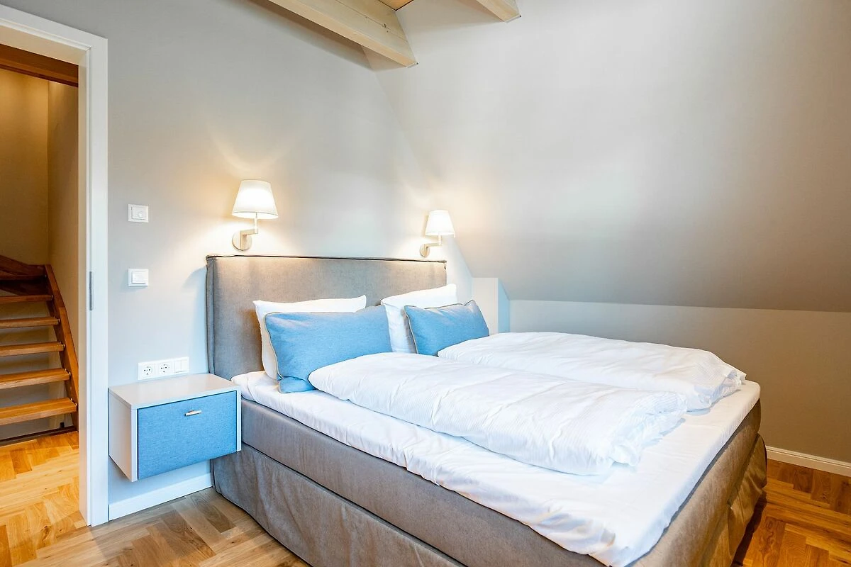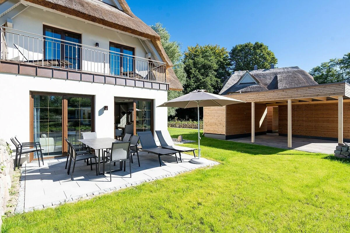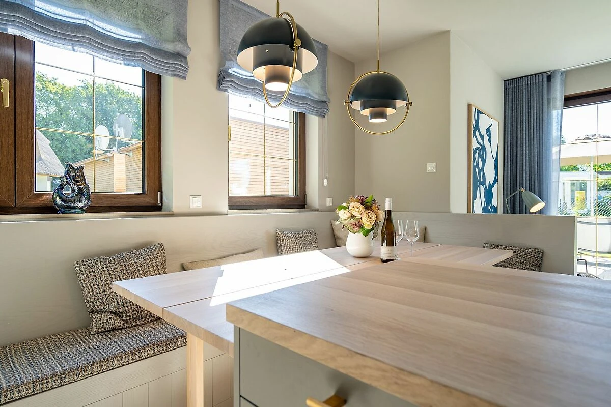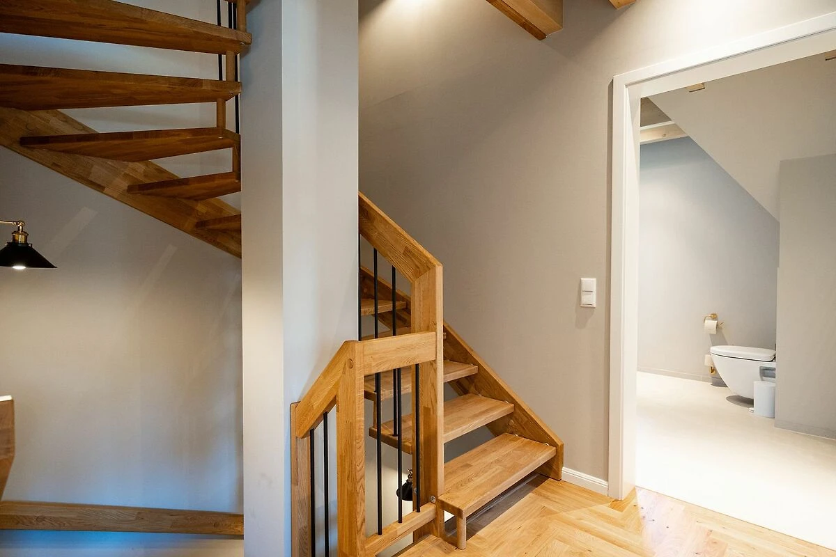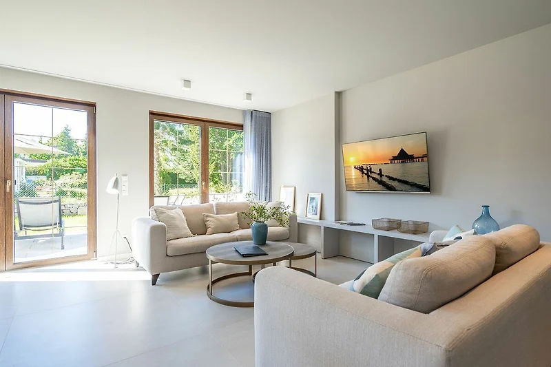 Willkommen im Ferienhaus Reet [&] Meer N°2 im Seebad Heringsdorf. Diese grosszügige Doppelhaushälfte erstreckt sich über drei Etagen und bietet Platz für bis zu 8 Personen. Im Erdgeschoss erwartet Sie eine offene Wohnküche mit einem gemütlichen Essplatz und einer einladenden Sitzgruppe. Hier können Sie gemeinsam Mahlzeiten zubereiten und geniessen. Ein Flat-TV und ein Kaminofen sorgen für zusätzlichen Komfort und eine behagliche Atmosphäre. Von hier aus gelangen Sie auf die Terrasse, die mit Gartenmöbeln ausgestattet ist und Ihnen eine schöne Möglichkeit bietet, die frische Luft im Freien zu geniessen. Das Erdgeschoss verfügt ausserdem über ein Badezimmer mit Dusche, WC und einer Finnischen Sauna, in der Sie wunderbar entspannen können. Ein Waschtrockner steht Ihnen ebenfalls zur Verfügung. Im ersten Obergeschoss finden Sie drei Schlafzimmer, jeweils mit einem komfortablen Boxspringdoppelbett (1,80m x 2,00m), einem Einbaukleiderschrank und in zwei der drei Zimmer ein Flat-TV. Hier können Sie sich zurückziehen und erholsame Nächte verbringen. Zusätzlich gibt es ein Badezimmer mit Dusche, Waschtisch und WC. Zwei Schlafzimmer bieten Ihnen zudem Zugang zum Balkon mit Sonnenliegen, von dem aus Sie den Blick auf die Umgebung geniessen können. Im Dachgeschoss befindet sich ein weiteres Schlafzimmer (aktuell noch ohne Verdunklungsmöglichkeit) mit einem Boxspringdoppelbett, Flat-TV und einer Kommode. Hier finden Sie auch ein kleines Badezimmer mit Waschtisch und WC. Das Dachgeschoss bietet somit zusätzlichen Platz für Ihre Gäste. Für Ihre Fahrzeuge steht ein Carport mit zwei Stellplätzen (mit E-Ladestation - kostenpflichtig) zur Verfügung, damit Sie bequem an- und abreisen können. Kostenfreies WLAN ist selbstverständlich ebenfalls vorhanden, sodass Sie mit Ihren Lieben in Verbindung bleiben können. Das Ferienhaus Reet [&] Meer N°2 in der Triftstrasse 10f verspricht Ihnen einen unvergesslichen Aufenthalt in Heringsdorf. Geniessen Sie die Annehmlichkeiten des Hauses, erkunden Sie die malerische Umgebung und erleben Sie erholsame Tage an der Ostsee.