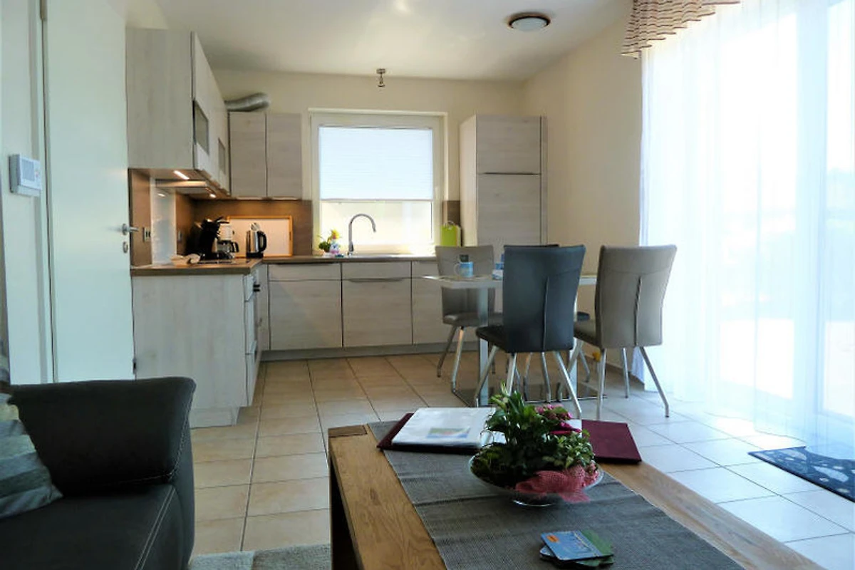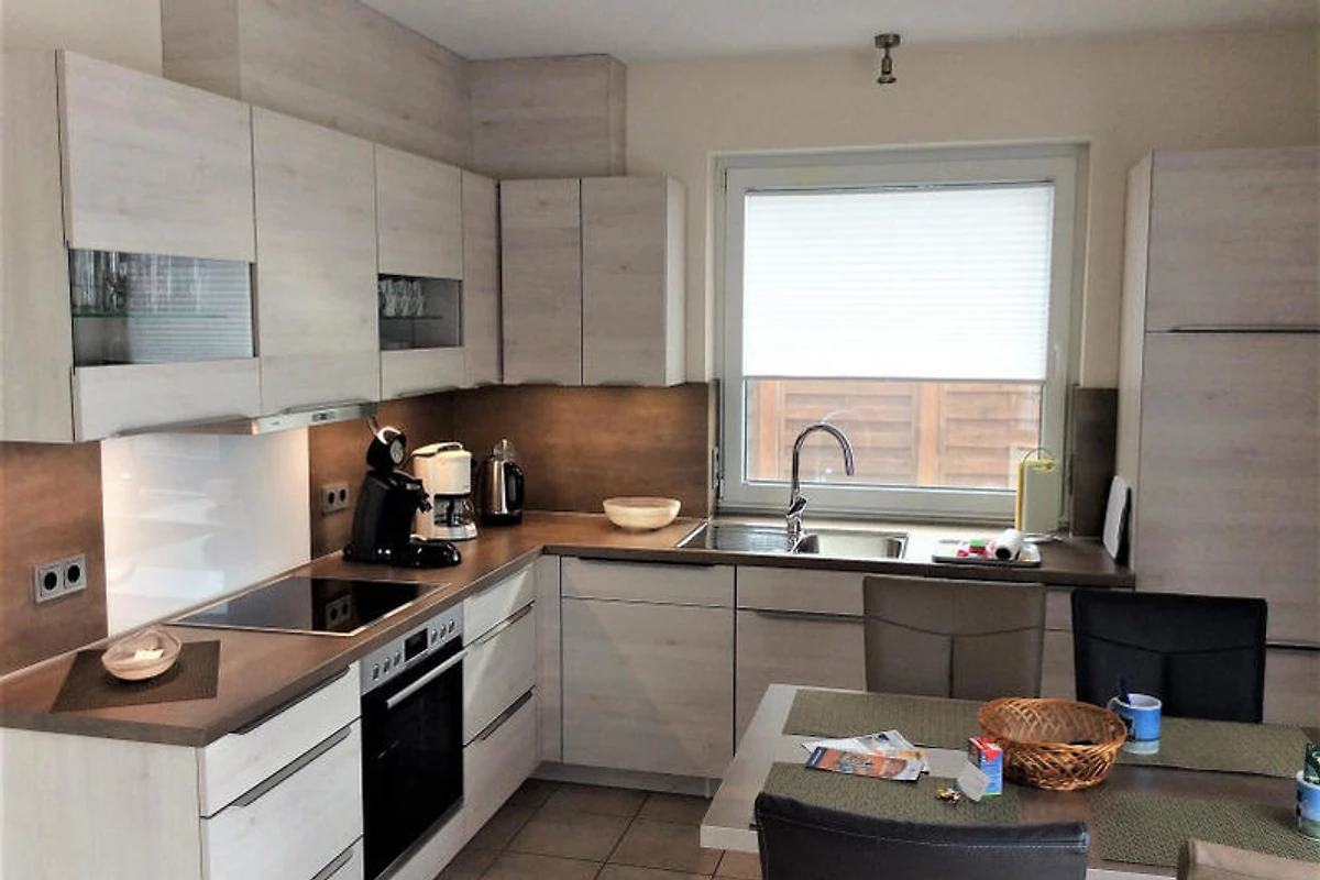 Der Wohn- Essraum hat eine gemuetliche Einrichtung mit SAT TV. Die Kuechenzeile ist mit einem Cerankochfeld, Geschirrspueler, Backofen, Waschmaschine und Kuehlschrank mit Gefrierfach ausgestattet. Im Elternschlafzimmer befindet sich ein Doppelbett (160 cm x 200 cm) mit Kleiderschrank . der PKW steht im Carport