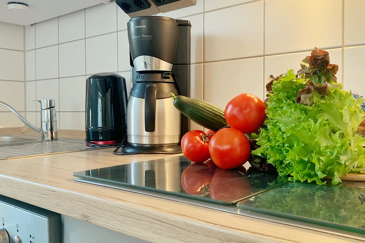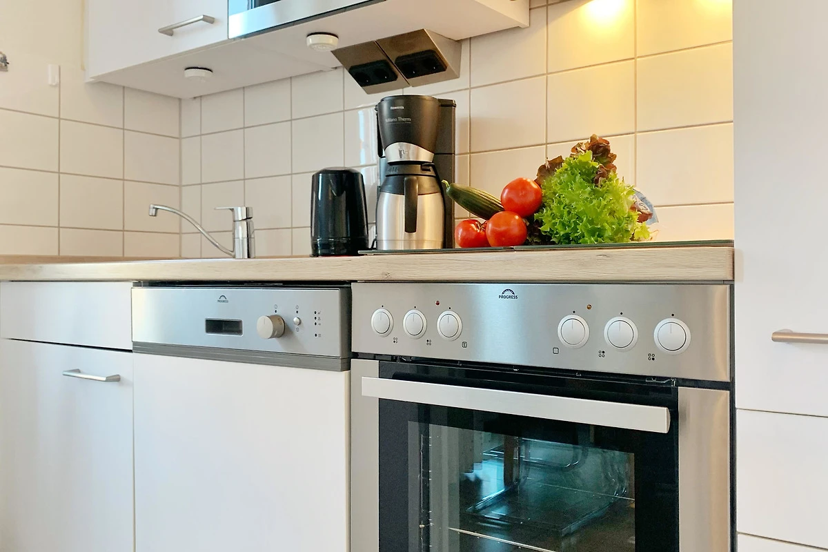 ( 2 Erw. im Elternschlafzimmer) und 2 Kinder Im Kinderzimmer (Hochbett) ausgerichtet bzw. für 4 Personen (2 Erw/2 Kinder) und ein Kind im Kinderreisebett. Das neue Wohnzimmer ist mit einer Essgruppe für 4 Personen ausgestattet. Ein Flachbildfernseher an der Wand mit 102 cm Diagonale wartet auf Ihre Nutzung. Die Küchenzeile ist komplett neu und mit Glaskeramik-Kochfeld, Herd, Backofen, Mikrowelle, Wasserkocher, Toaster, Kaffeemaschine, Eierkocher, Mixer, Stabmixer und Kochtöpfen, Geschirr und Geschirrspüler eingerichtet.