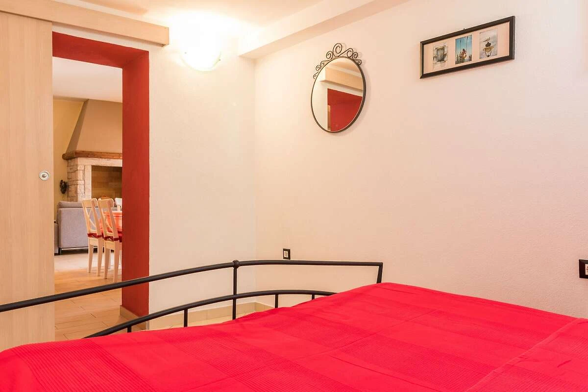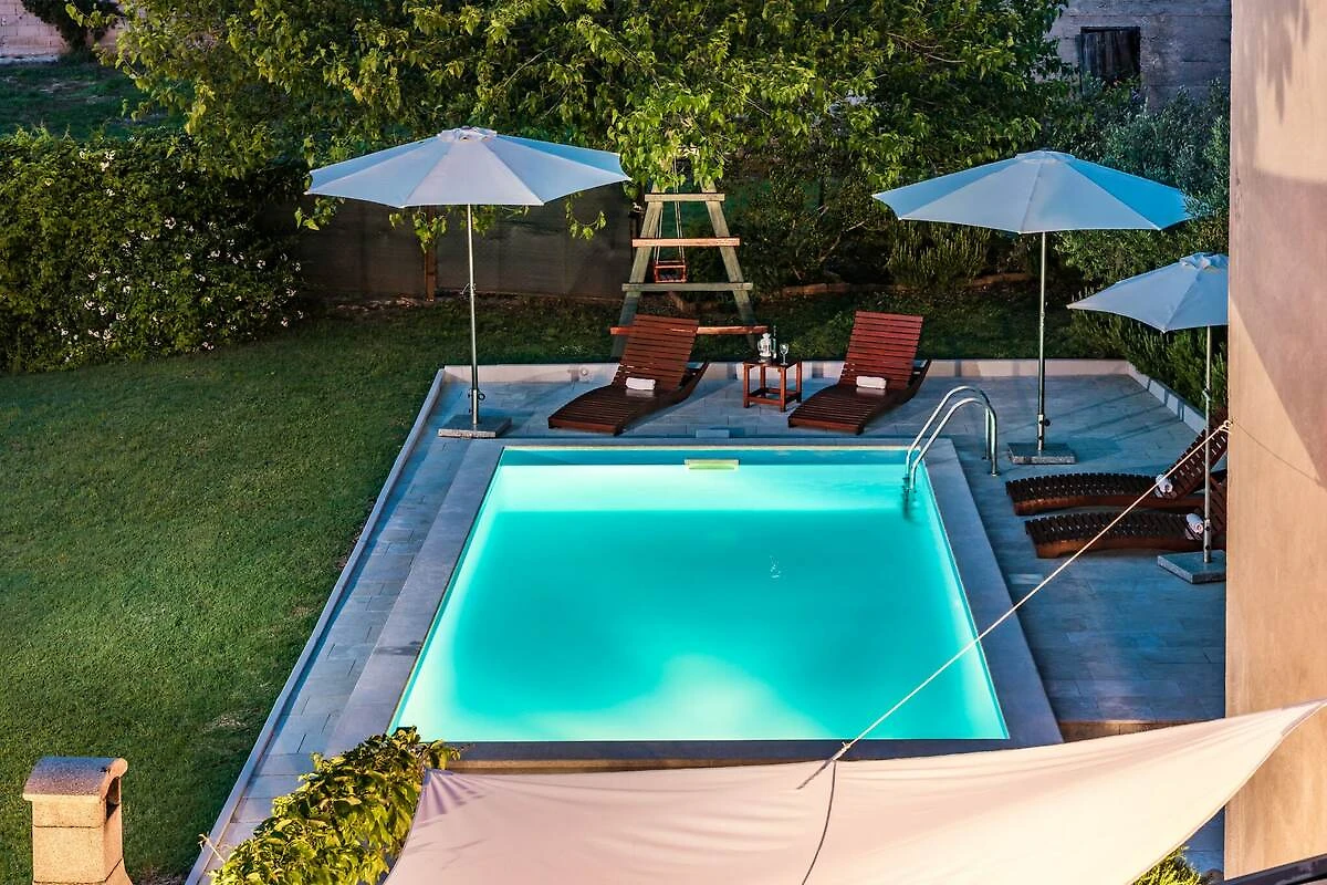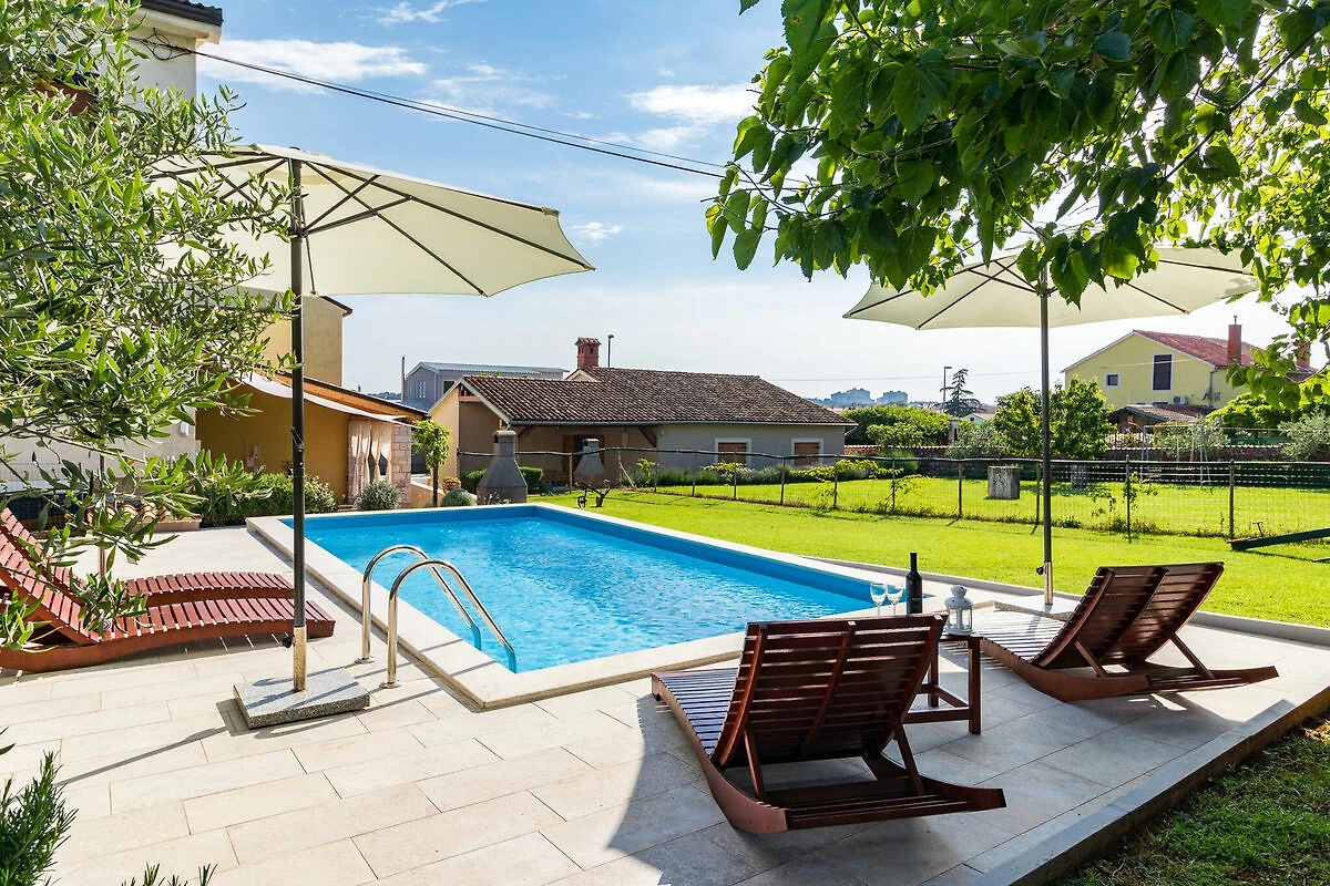 Casa Luigia in Pula besteht aus zwei Wohnungen, ideal für Familien mit Kindern oder eine Gruppe von Freunden. Das Ferienhaus verfügt über einen Garten mit einem eigenen Pool und Sonnenliegen, Spielgeräten und einer überdachten Terrasse mit einem Esstisch. Das Interieur ist ordentlich, die farbigen Wände und Stoffe machen das Haus heiter und gemütlich.