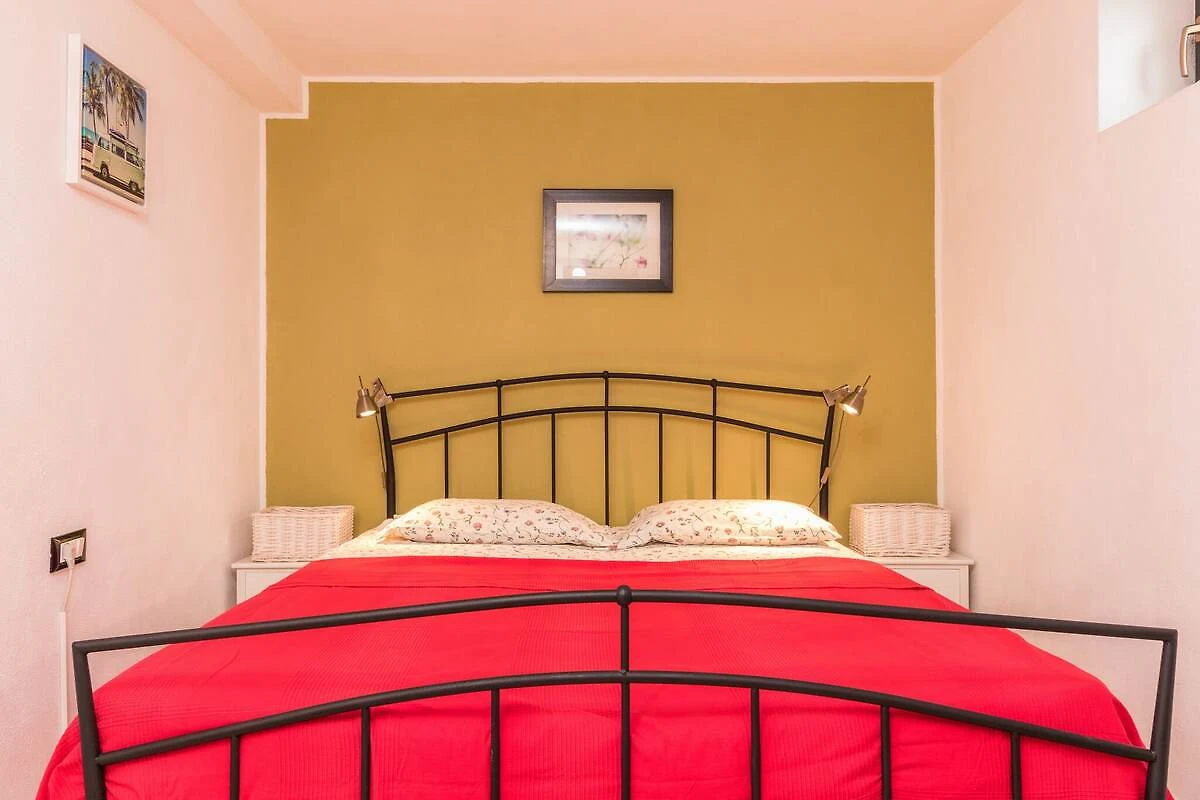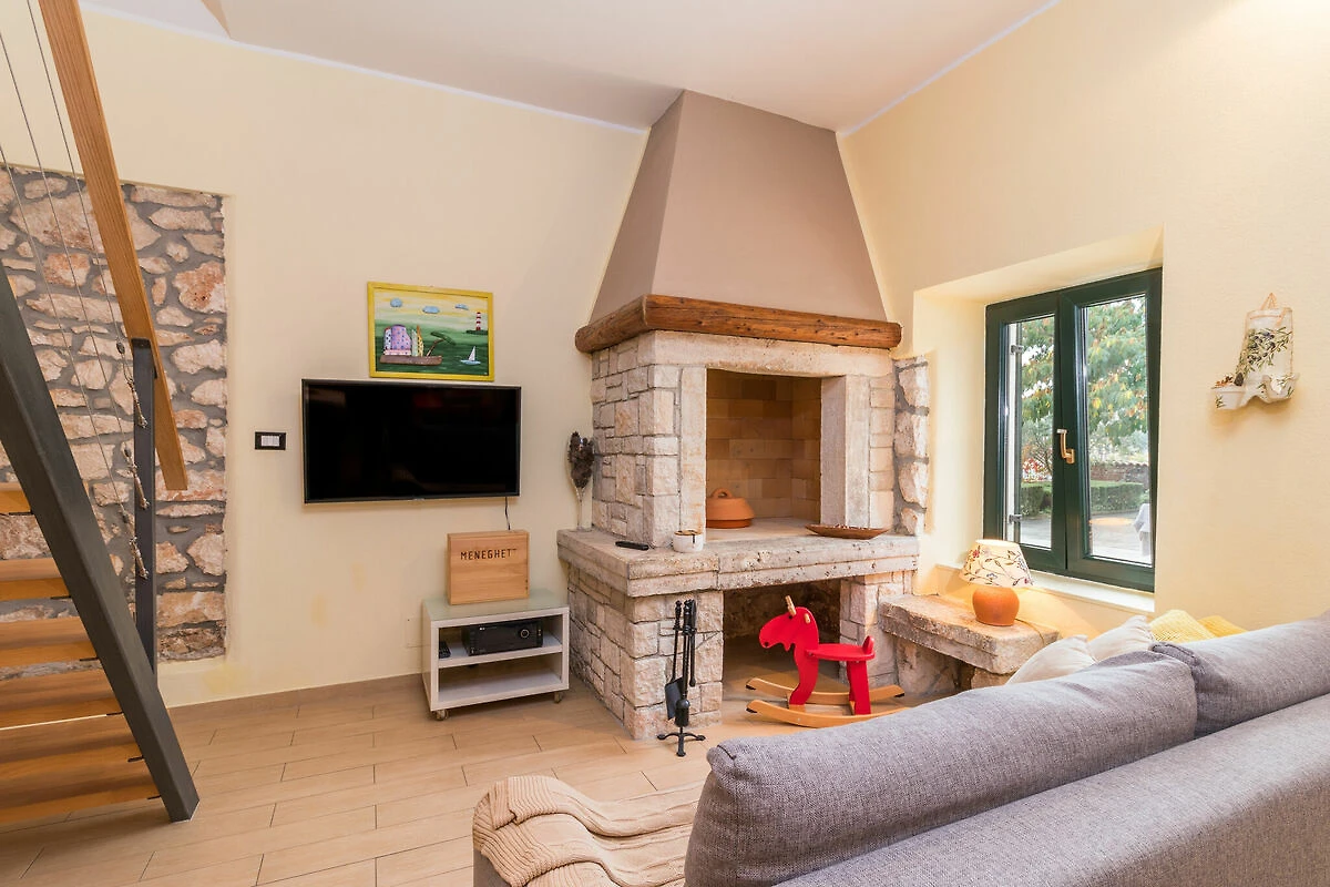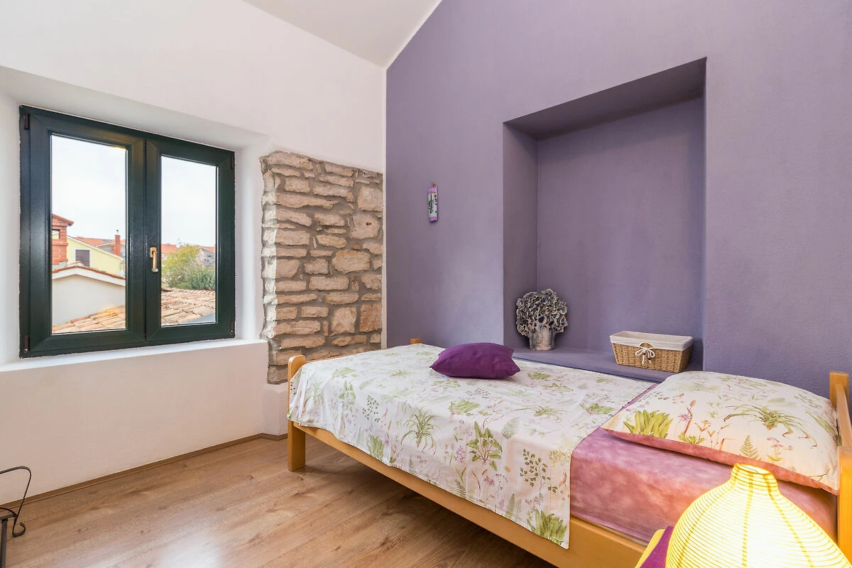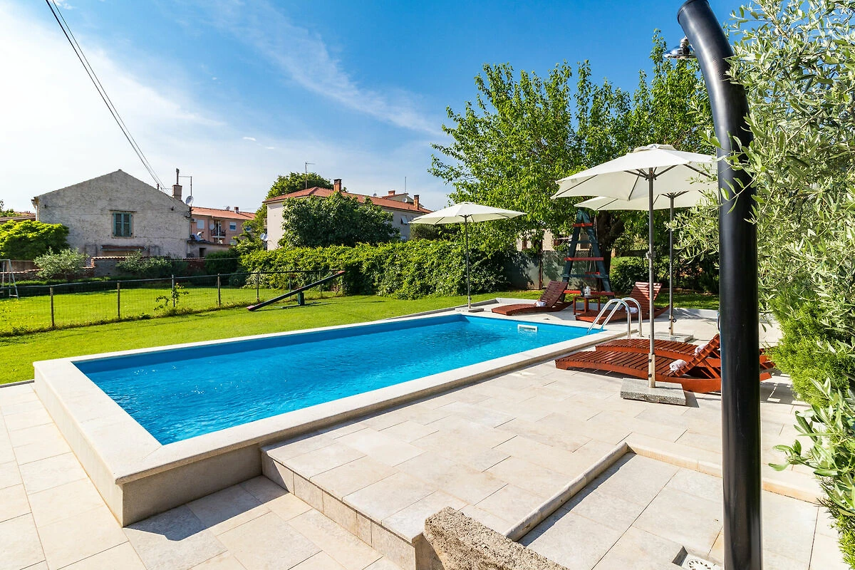 Casa Luigia in Pula besteht aus zwei Wohnungen, ideal für Familien mit Kindern oder eine Gruppe von Freunden. Das Ferienhaus verfügt über einen Garten mit einem eigenen Pool und Sonnenliegen, Spielgeräten und einer überdachten Terrasse mit einem Esstisch. Das Interieur ist ordentlich, die farbigen Wände und Stoffe machen das Haus heiter und gemütlich.