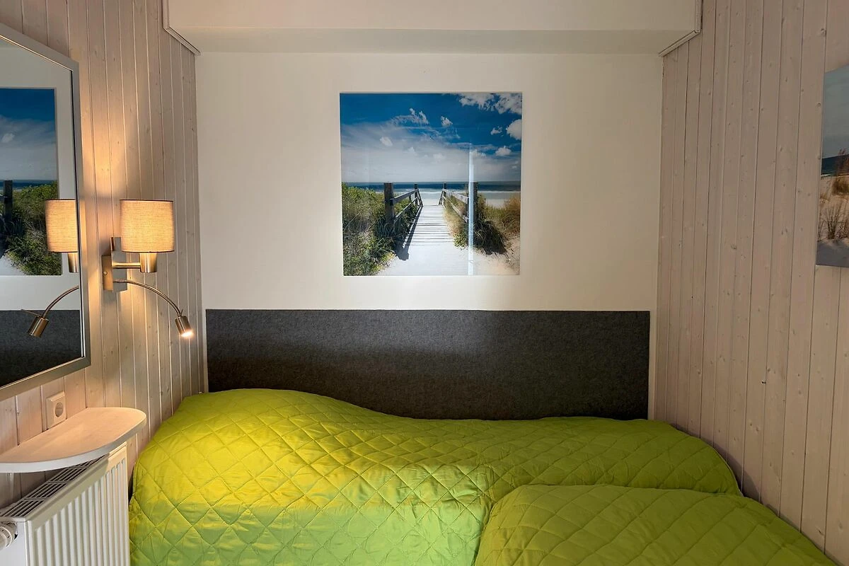 Über die Treppe erreichst du das Erdgeschoß. Das Herzstück im Erdgeschoß ist das kleine aber feine Wellness-Bad mit einer Trockensauna. Freu dich auf die bodentiefe Regendusche. Ein Badschrank mit Schubladen für Ihre Kosmetikartikel befindet sich unter dem Waschbecken. Ebenfalls im Erdgeschoss befinden sich zwei Schlafzimmer: Das Erste liegt zur Seeseite. Es verfügt über bodentiefe Fenster, einen wunderschönen Blick in den Strandgarten und eine geräumige Terrasse. Du schläfst in zwei nebeneinander stehenden, bequemen Einzel-Boxspringbetten (zusammen 180x200cm). Im diesem Schlafzimmer befindet sich ein Fernseher, die Fenster verfügen über Verdunkelungsvorhänge für einen ungestörten Schlaf. Das andere Schlafzimmer verfügt ebenfalls über zwei Einzel- Boxspringbetten (je 90x200cm), sie stehen über Eck. Ein Verdunkelungsrollo sorgt für erholsamen Schlaf. Dieses Zimmer hat eine große Tür, die nach draußen auf die Holzdielen führt. Im Außenbereich befinden sich mehrere Sitzmöglichkeiten mit und ohne Tisch, ein Sonnenschirm, Sonnenliegen sowie ein hochwertiger Holzkohlegrill.