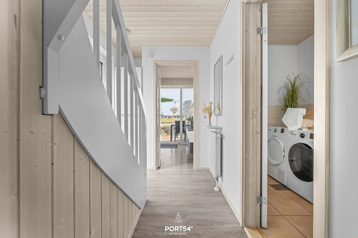 Das Haus bietet zwei separate Schlafzimmer und einen weiteren Schlafbereich (Schlafcouch im Wohnzimmer) mit insgesamt bis zu sechs Schlafmöglichkeiten. Im modern gestalteten Badezimmer befindet sich eine bodengleiche Dusche, Fußbodenheizung, WC, Waschbecken und Haartrockner. Waschmaschine und Trockner stehen zur Eigennutzung bereit – ideal für längere Aufenthalte oder Familien mit Kindern. Zur weiteren Ausstattung zählen Staubsauger, Wäscheständer und Garderobe.