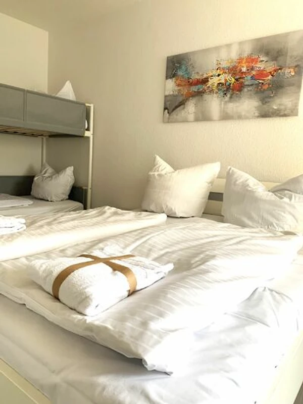 Insgesamt 56 m² Wohnfläche verteilen sich auf eine Eingangsdiele, einen großzügigen Wohn- Essraum), eine moderne Küche und ein Schlafzimmer mit Doppel- und Etagenbett. Der großzügige Balkon ist nach Norden ausgerichtet.
