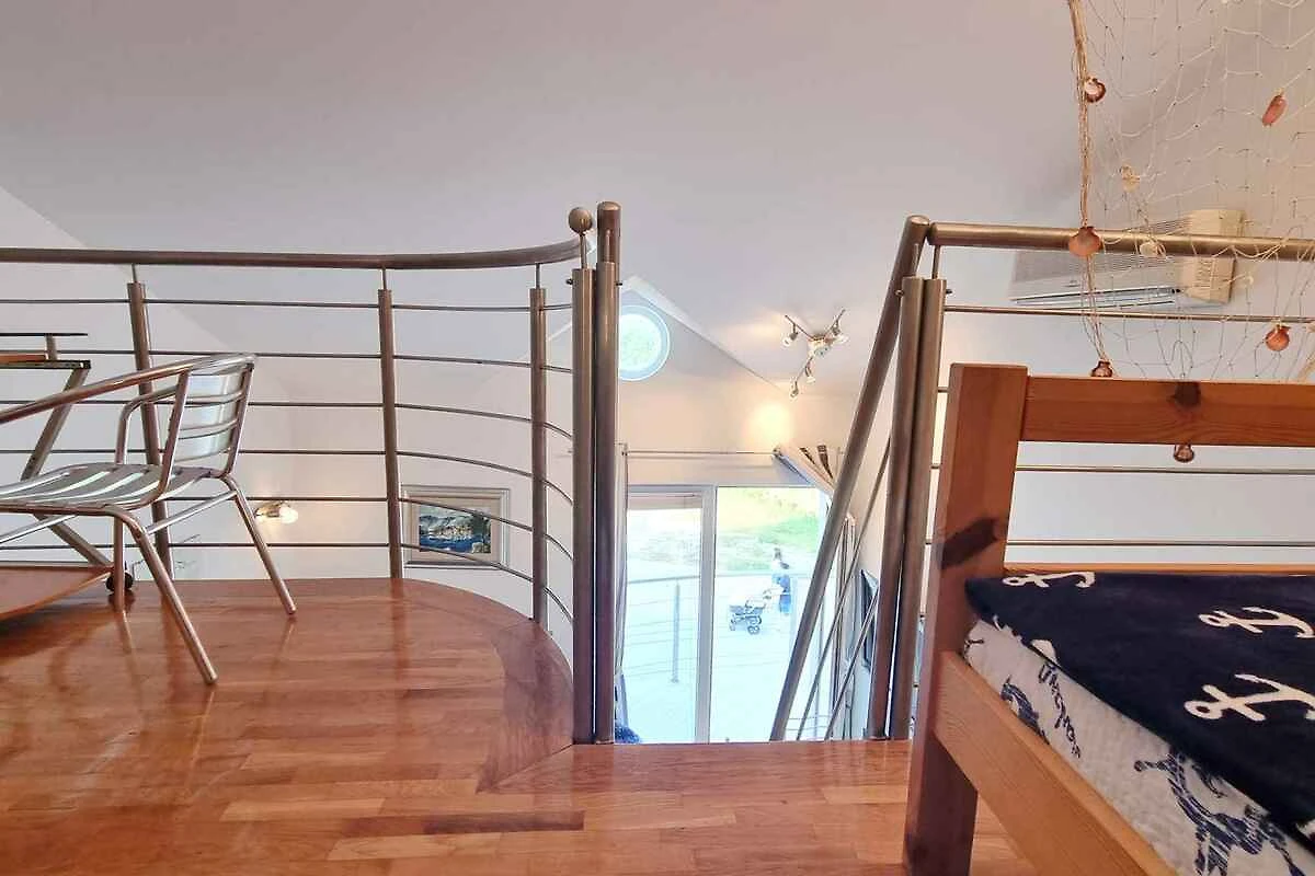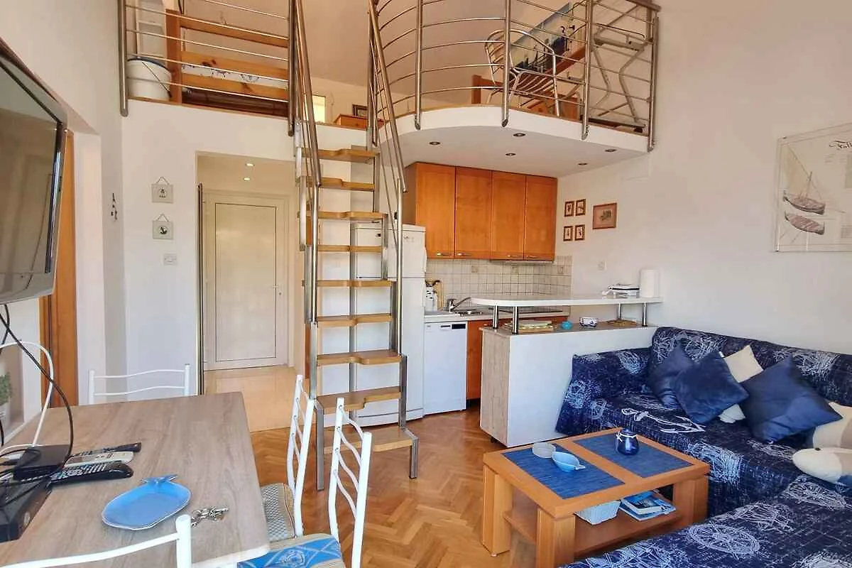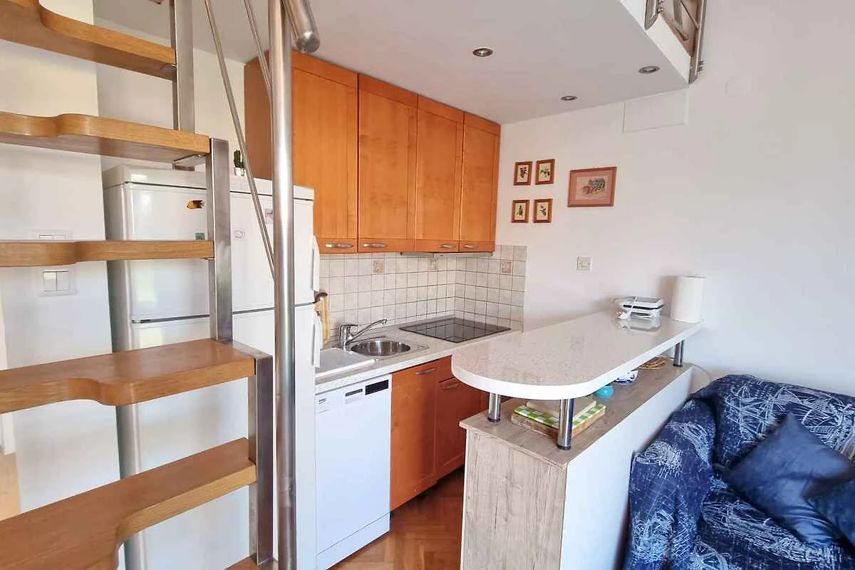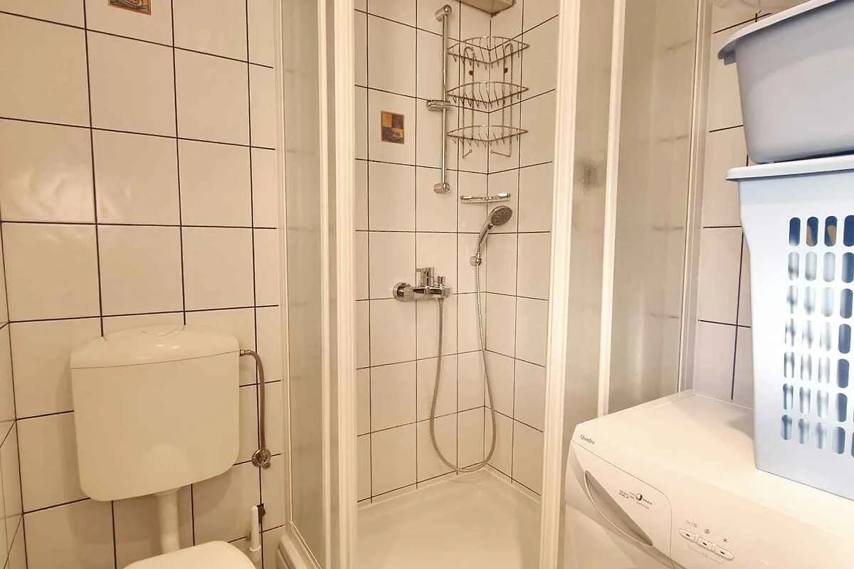 . Wohnküche mit 2 Zusatzbetten auf Bett (kleiner 2,00 x 0,90 m), Sitzecke, TV, Essecke (4 Plätze), Zugang zum Balkon und the beds are on a sleeping gallery. Schlafzimmer mit 1 Doppelbett. Kochnische in der Wohnküche mit Elektroherd, Geschirrspüler, Kühlschrank (Eisfach), Kaffeemaschine und Zugang zum Balkon. Bad mit Waschmaschine, Dusche, 1 Waschbecken und WC.