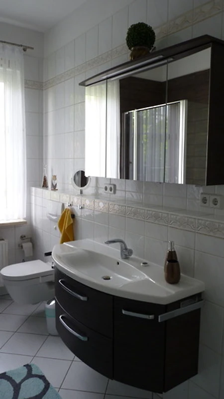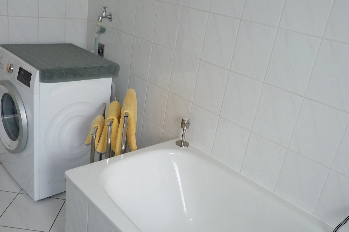 Im Badezimmer befinden sich eine Dusche und Badewanne, ein Waschtisch sowie das WC und eine Waschmaschine.