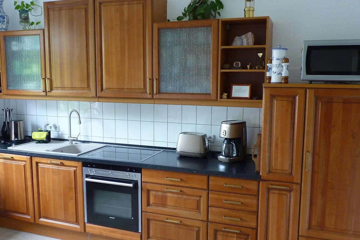 Die wunderschöne Küche bietet Ihnen einen direkten Blick ins Grüne. Die Küche verfügt über eine gehobene Komplettausstattung (Backofen, Induktions-Kochfeld, Kühlschrank- und Gefrierkombination, Geschirrspüler, Mikrowelle, Kaffeemaschine, Wasserkocher, Toaster, Radio) und einen Esstisch mit Stühlen.