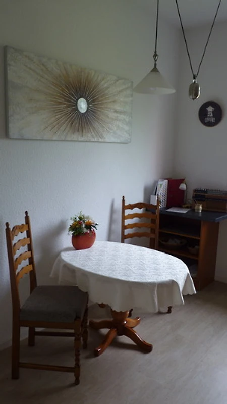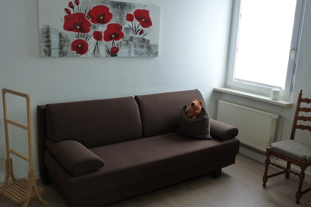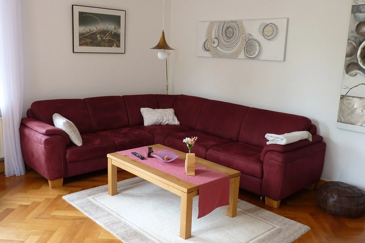 Der grosse helle Wohnbereich mit Wohn- und Speisezimmer (trennbar durch grosse Glasschiebetür) sowie grosszügigem Balkon lädt zur Entspannung ein. Von hier haben Sie einen fantastischen Ausblick auf das Kunsthaus Meyenburg. Das Sofa lässt sich als Schlafsofa (1,90 mx 1,60 m) für 2 Personen ausziehen. Zur Ausstattung gehören auch ein 49"Prime; Ultra-HD Smart-TV, ein antikes Buffet sowie ein historisches Grammophon. Im Speisezimmer können bequem 8 Personen sitzen.