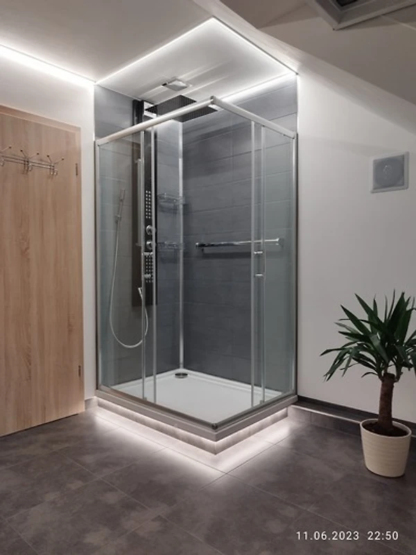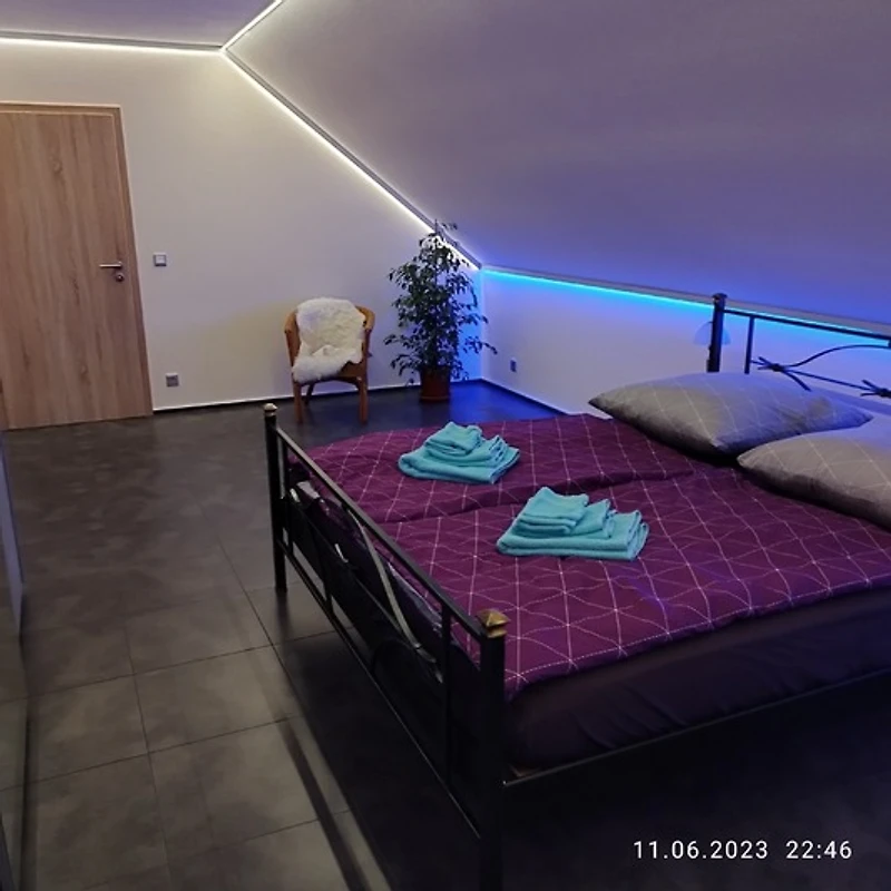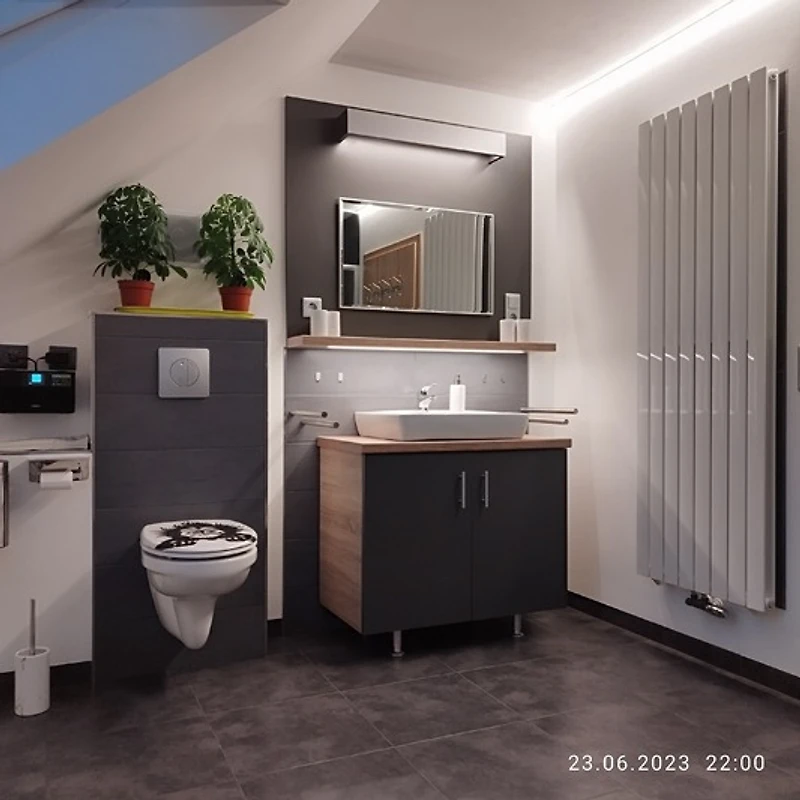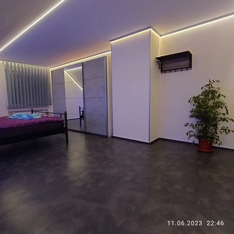 Zum Wohlfühlen, sind beide Schlafzimmer ebenfalls mit dimmbarer LED-Ambientebeleuchtung ausgestattet. Auch in der voll ausgestattete Küche wird es an nichts fehlen. Selbst wenn Sie das Bad betreten können Sie sich mit Musik berieseln lassen.