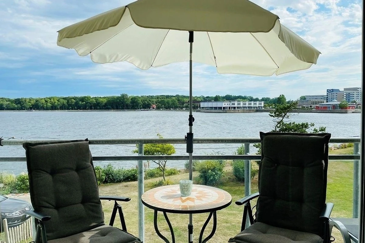 Vom Wohnzimmer aus gelangen Sie auf den Südbalkon mit Seeblick (Binnensee).