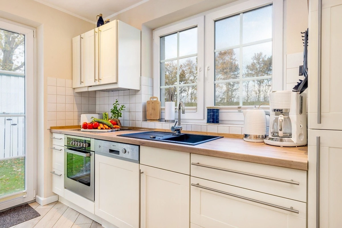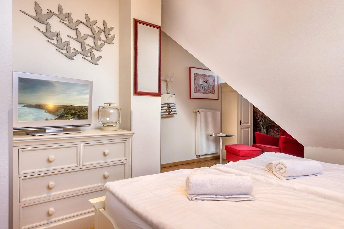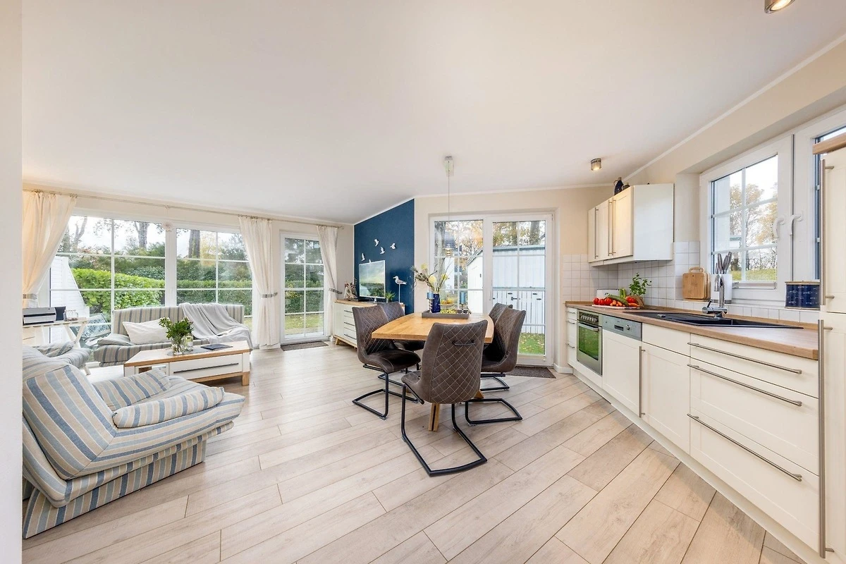 Die Ferienwohnung bietet einen komfortablen Rückzugsort mit drei durchdacht gestalteten Schlafzimmern, darunter zwei Doppelbetten und ein Einzelbett. Die offene Küche ist vollständig ausgestattet mit modernen Geräten, einschliesslich Geschirrspüler, Elektro-/Gasherd, Backofen, Mikrowelle und Kühlschrank. Der Essbereich mit Esstisch und ausreichend Geschirr sowie Besteck lädt zu gemeinsamen Mahlzeiten ein. Zwei Badezimmer, eines davon mit bodengleicher Dusche, gewährleisten Komfort für alle Gäste.