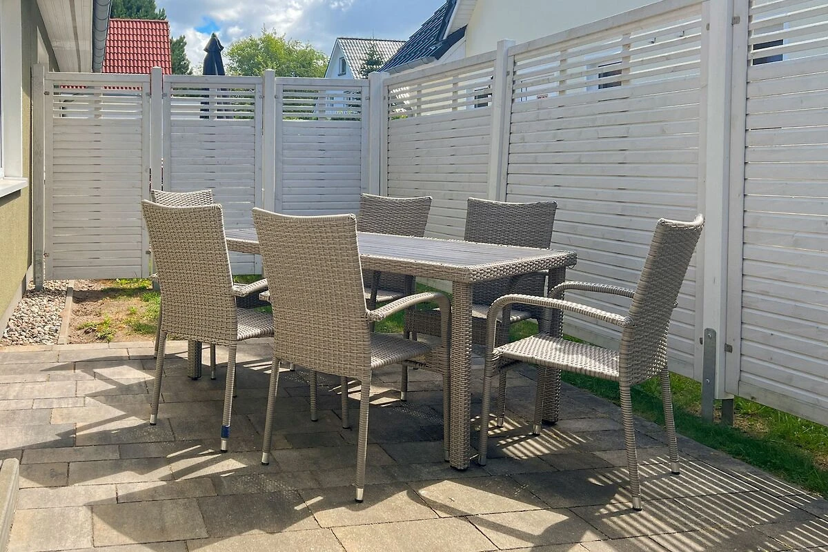 Nach einem erlebnisreichen Tag an der frischen Ostseeluft lädt die private Sauna zum Entspannen ein und bietet die perfekte Möglichkeit, müde Muskeln zu lockern und zur Ruhe zu kommen. Starten Sie den Tag auf der sonnigen Terrasse mit einem gemütlichen Frühstück oder geniessen Sie abends die letzten Sonnenstrahlen im Garten. Die hochwertigen Gartenmöbel und der Sonnenschirm bieten zusätzlichen Komfort für entspannte Stunden im Freien.