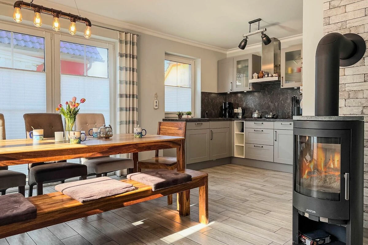 Das Ferienhaus Windspiel empfängt Sie mit einer warmen und einladenden Atmosphäre. Der grosszügige Wohnbereich mit Kamin ist das Herz des Hauses und lädt zu entspannten Abenden ein sei es bei einem guten Buch oder einem gemeinsamen Spieleabend. Die moderne Küche ist vollständig ausgestattet, sodass Sie mühelos köstliche Mahlzeiten für Ihre Liebsten zubereiten können.