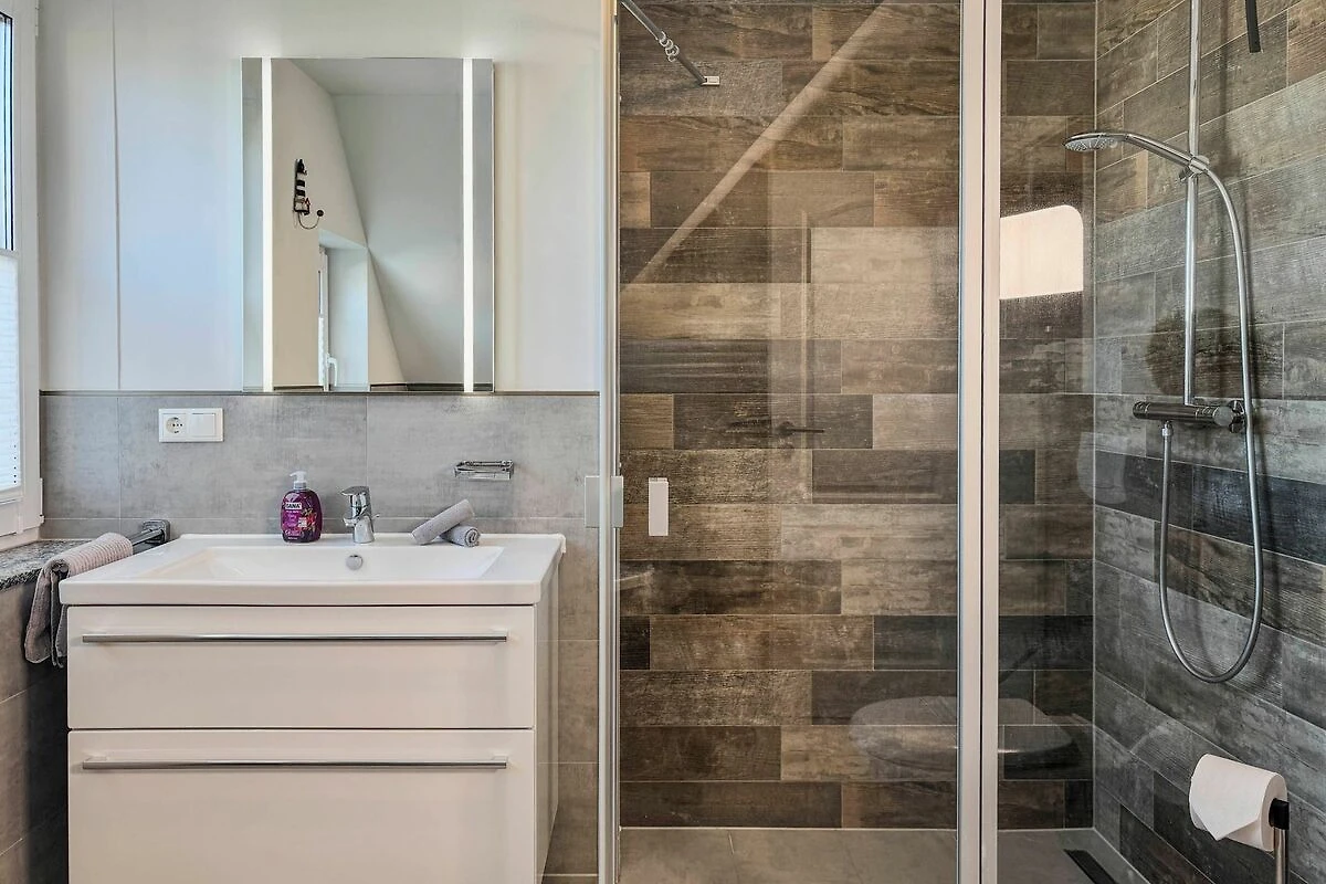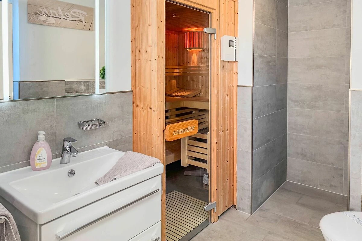 • Zwei Badezimmer: eines mit Badewanne und Dusche, eines mit Dusche und Sauna
