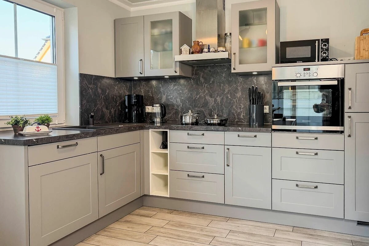 • Voll ausgestattete Küche mit Geschirrspüler, Backofen, Kochfeld, Kühlschrank, Mikrowelle, Filterkaffeemaschine, Toaster und Wasserkocher