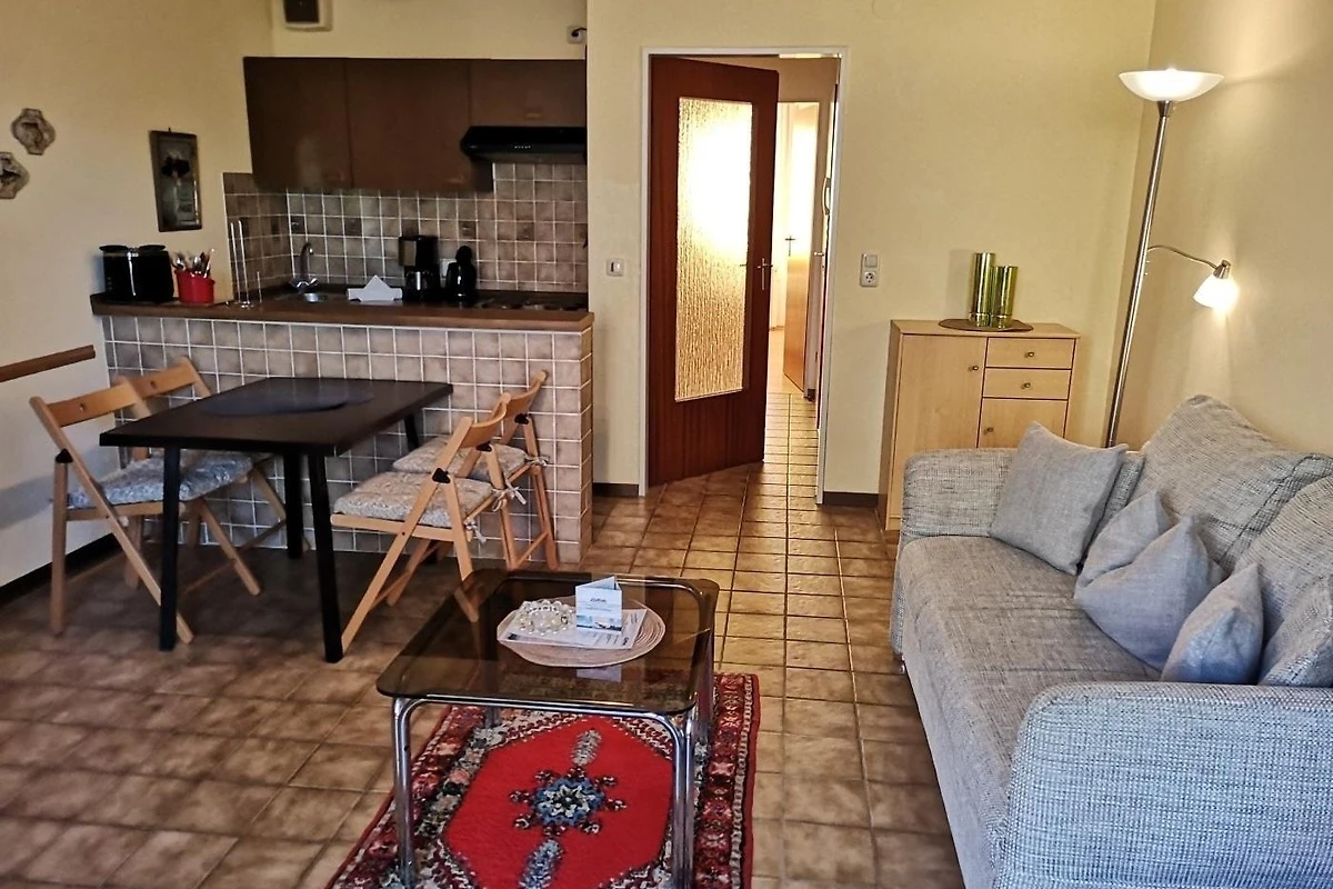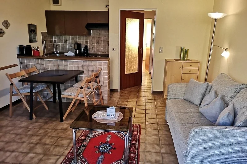 Die Ferienwohnung besteht aus: Wohnschlafraum mit Doppelbettcouch, Küchenzeile, Essecke, Farb-TV, Terrasse, Schlafzimmer mit Doppelbett, Dusche, WC.