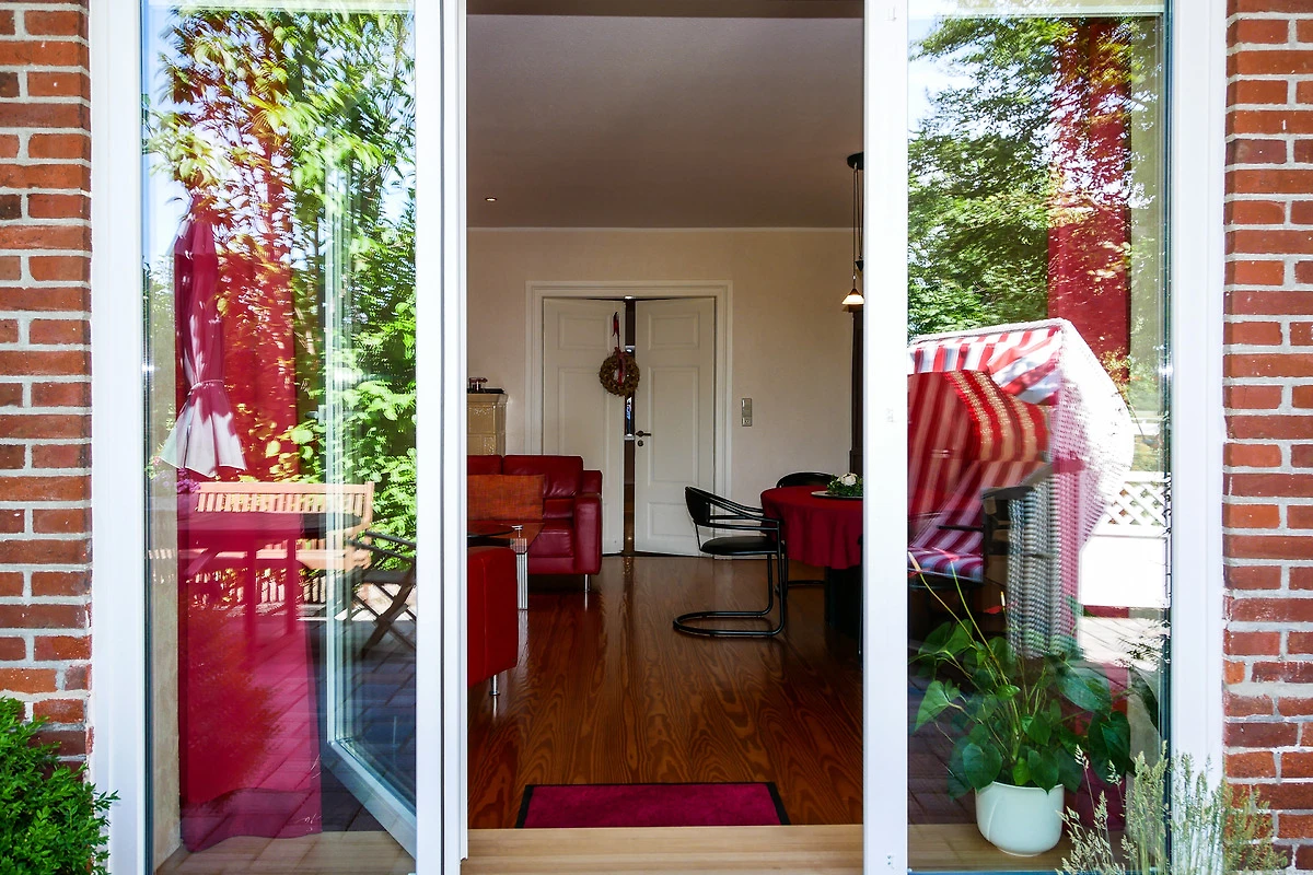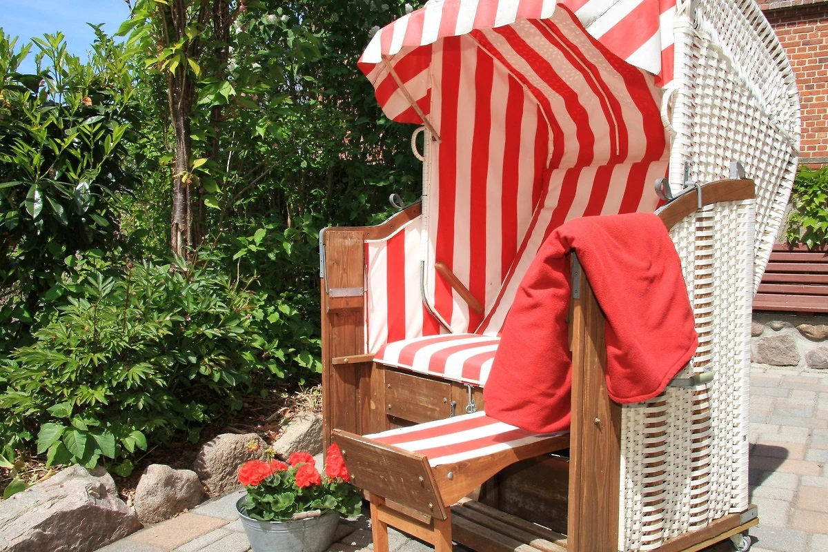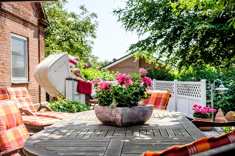 Die schöne Süd-West-Terrasse besticht mit Teakholzmöbeln, Strandkorb, Liegen und Sonnenschirm und liegt direkt zum idyllischen Garten.